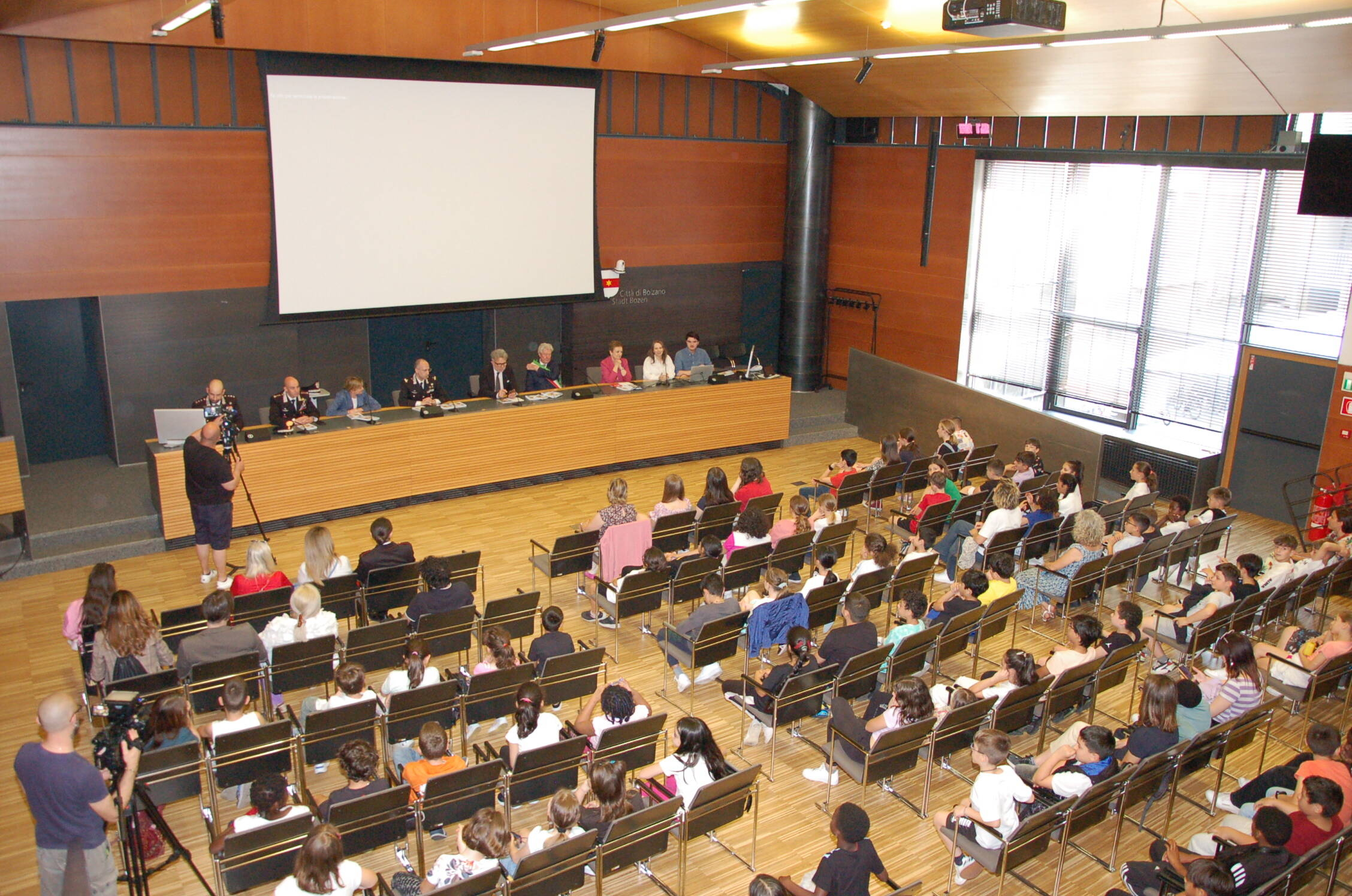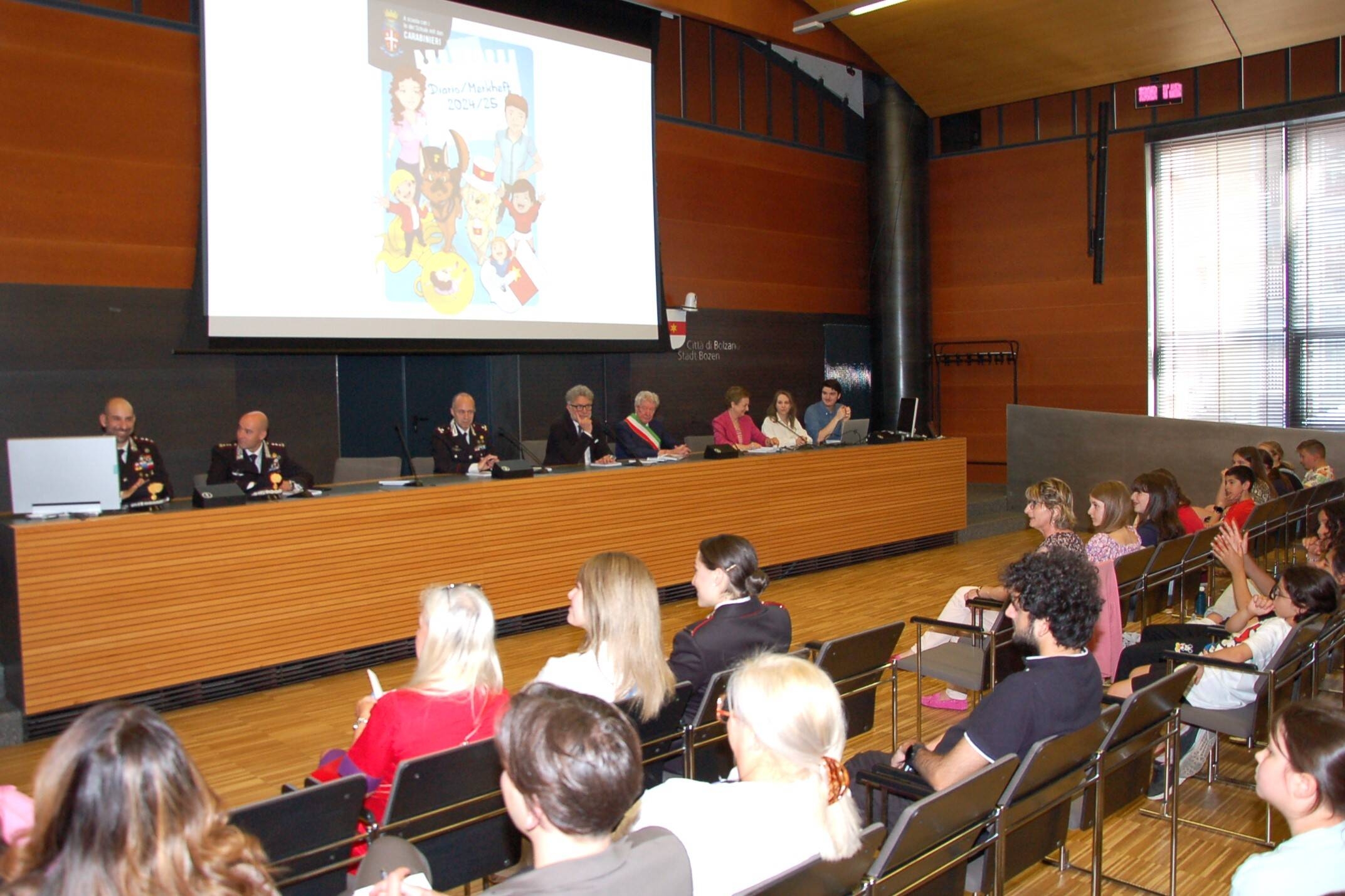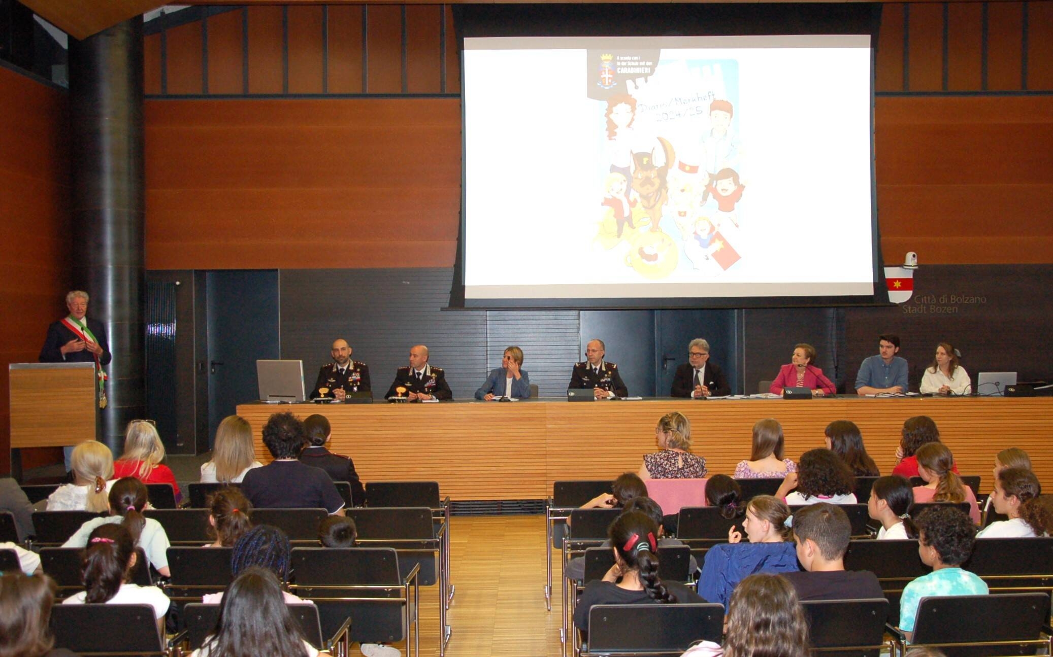 La cerimonia si è svolta alla presenza del Sindaco Renzo Caramaschi, dell'Assessora alla Scuola Johanna Ramoser e del Comandante delle Legione Carabinieri del Trentino Alto Adige Roberto Riccardi. Sono intervenuti anche il Comandante Provinciale dei Carabinieri Raffaele Rivola ed il Comandante della Compagnia Carabinieri di Bolzano Stefano Esposito Vangone. Ringraziamenti sono stati rivolti dal Sindaco e dall'Assessora Ramoser all'Arma dei Carabinieri per la grande disponibilità, l'aiuto, i consigli ed il grande impegno profuso nel progetto. Non da meno le direzioni scolastiche e gli insegnanti che hanno contribuito con passione e professionalità alla realizzazione della pubblicazione. Il plauso più grande è andato comunque agli scolari e agli studenti che anche durante la presentazione in Sala di Rappresentanza hanno dimostrato grande interesse e partecipazione. Il diario "A scuola con i Carabinieri" è stato realizzato dall'Ufficio Scuola e Tempo Libero del Comune diretto da Patrizia Caleffi. Al progetto hanno lavorato gli addetti del Comune Peter Orlando e Lara Valentini, le traduzioni da Claudia Tarfusser, mentre le illustrazioni tematiche sono state curate da Gabriella Degasperi e Simone Gagliardi.