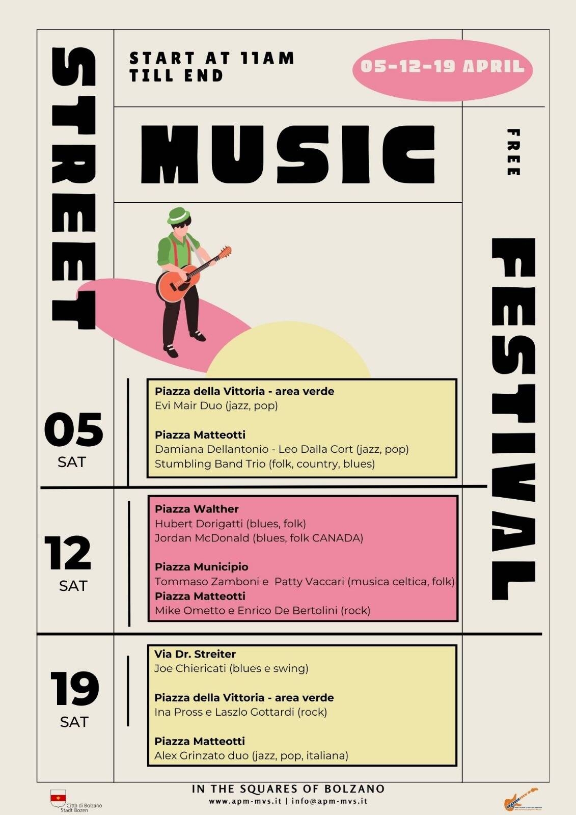 Nell'ambito di "Bolzano Città Creativa della Musica UNESCO" gli Assessorati comunali alla Cultura, ai Giovani e alle Attività Economiche e Turismo intendono valorizzare e promuovere nel periodo primaverile, varie iniziative e manifestazioni musicali di ogni genere nelle piazze, nelle strade, nei teatri e nelle sale cittadine. E' all' interno della rassegna Primavera in Musica che l'Assessorato alla Cultura ha inserito l'iniziativa denominata: Street Music Festival che si svolgerà in varie strade e piazze cittadine per stimolare la socialità all’insegna della buona musica con i musicisti che si esibiranno in modalità Matinee on the road con strumentazioni e amplificazioni autonome. Street Music Festival è in programma sabato 5,12 e 19 aprile e sarà articolato capillarmente in varie zone della città.