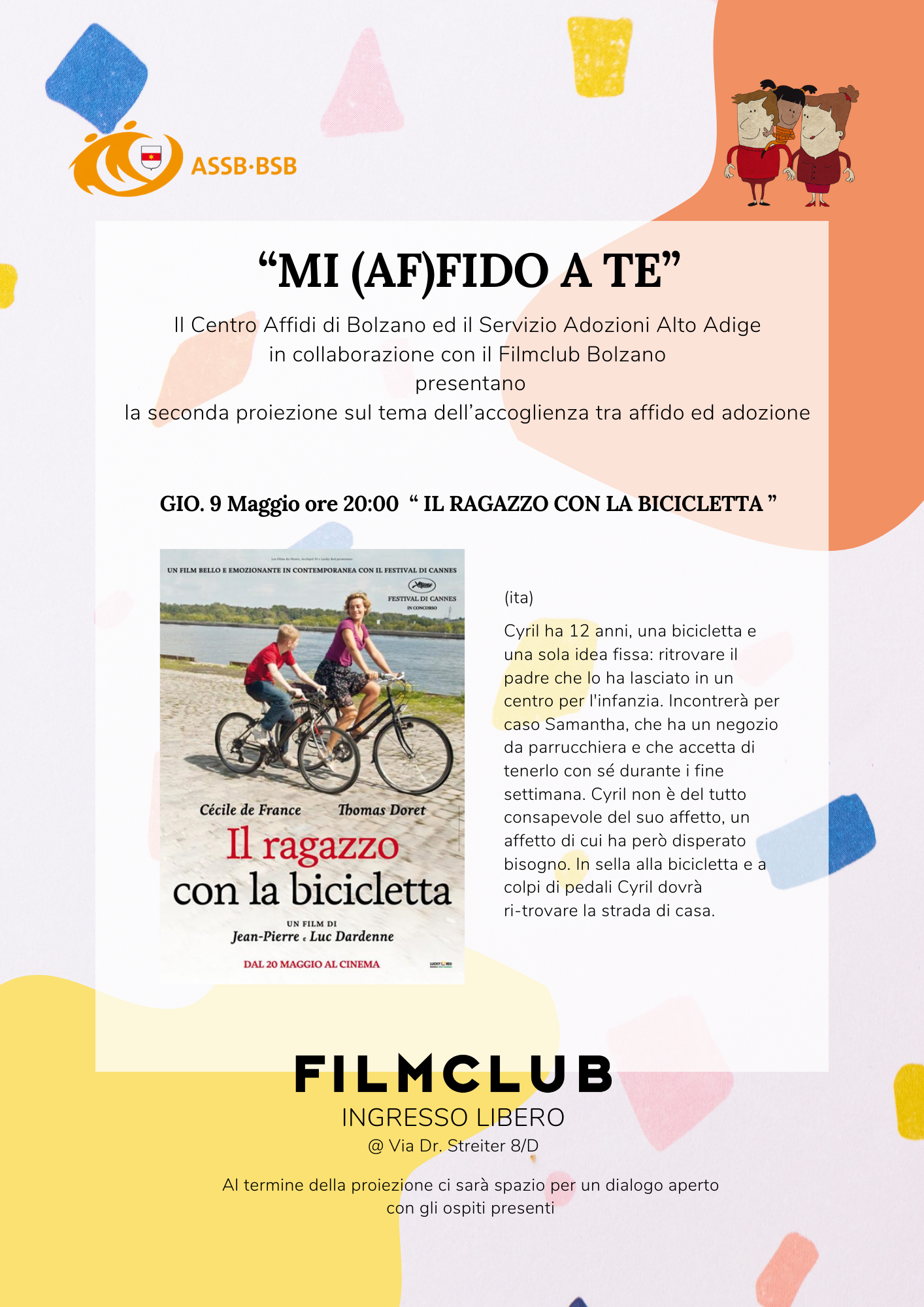 "Il Filmclub di Bolzano in collaborazione con il Servizio Adozioni Alto Adige ed il Centro Affidi organizza la rassegna cinematografica “Mi (af)fido a te”, che tratterà il tema dell’accoglienza famigliare di minori. Presso il Filmclub di via dr. Streiter 8/D giovedi 9 maggio alle ore 20:00 si terrà la proiezione del secondo lungometraggio: Il ragazzo con la bicicletta.