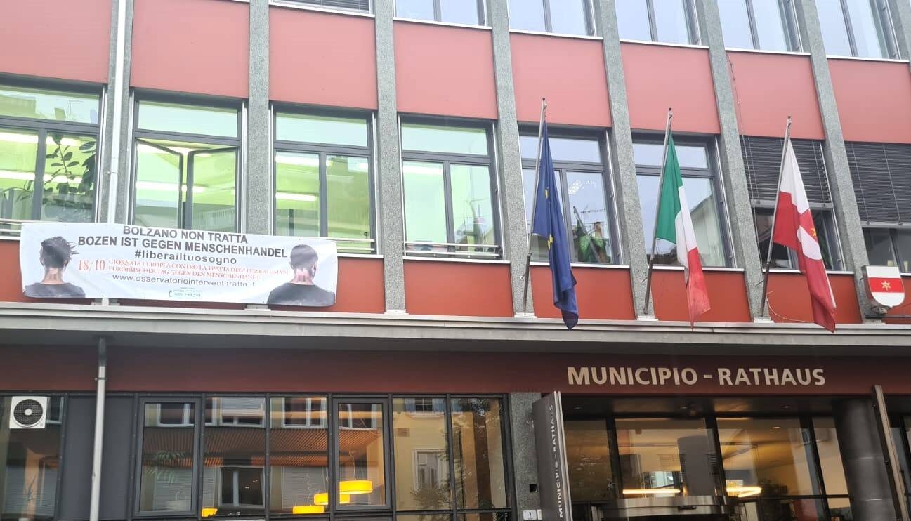In occasione della 18a Giornata Europea contro la tratta di esseri umani (18.10.24) alcune operatrici del Progetto ALBA hanno consegnato al Sindaco Renzo Caramaschi lo striscione "BOLZANO NON TRATTA" poi esposto sulla facciata del municipio. Nato a Bolzano nel 2003 ALBA promuove progetti di assistenza e protezione sociale con l’obiettivo di inserire nel tessuto socio-lavorativo, persone vittime di tratta e sfruttamento.