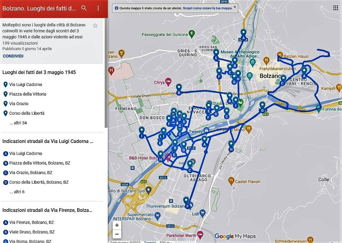 In occasione della ricorrenza dei drammatici eventi del 3 maggio 1945 a Bolzano, l'Assessorato alla Cultura del Comune capoluogo, attraverso l'Archivio Storico propone un itinerario interattivo per riscoprire i molteplici luoghi tragicamente coinvolti in varie forme dagli scontri e dalle azioni violente ad essi collegate.