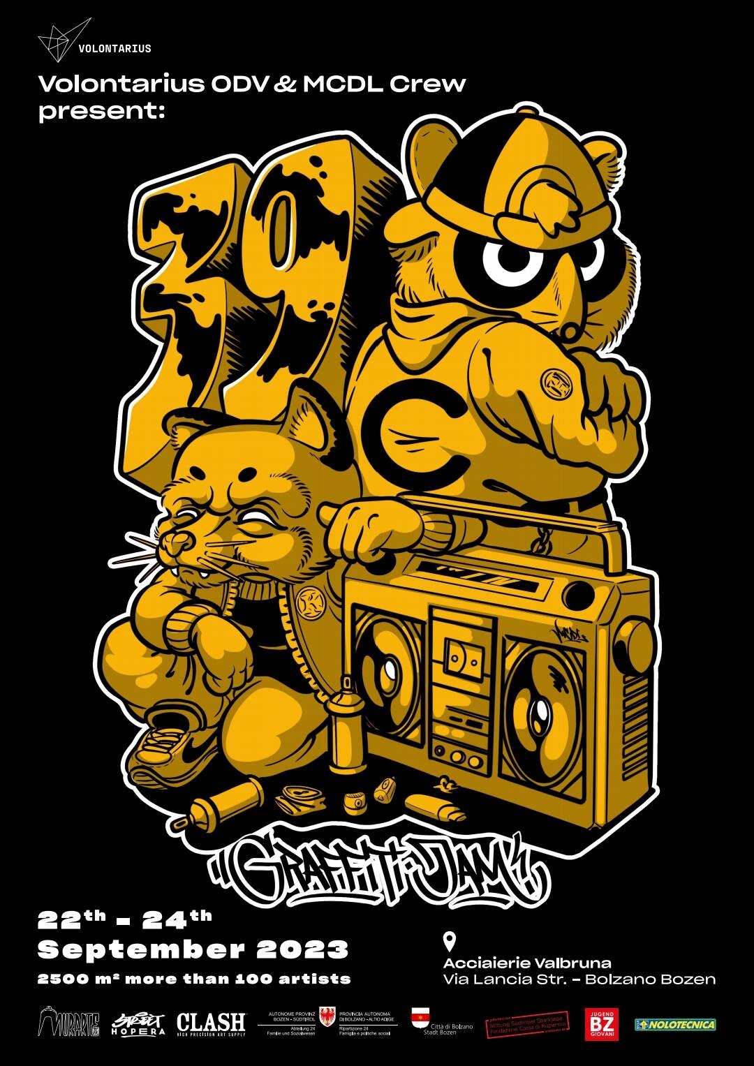 Il Meeting internazionale di graffiti 39C Bolzano Graffiti Jam che quest'anno festeggia il suo decimo compleanno, fa parte del programma di attività del progetto MurArte, realizzato da Volontarius in stretta collaborazione con l’Ufficio Giovani del Comune. Fin dalla sua prima edizione, realizzata nel 2011, e sempre più, il meeting di graffiti 39C ha suscitato grande attenzione e interesse sia da parte del panorama internazionale più strettamente correlato al writing, che dei media, delle istituzioni e della cittadinanza che hanno sempre accolto positivamente gli interventi realizzati. Quest’anno, dopo una lunga pausa dovuta principalmente alla pandemia, 39C Graffiti Jam giunge alla sua decima edizione. L' importante appuntamento si terrà dal 23 al 24 settembre in via Lancia e via Grandi. Per l’occasione, il meeting sarà particolarmente ricco e coinvolgente. Presenti più di 80 artisti internazionali, i graffiti verranno realizzati sul muro di cinta delle Acciaierie Valbruna come pure su alcuni muri presenti in via Buozzi. Ci saranno gli operatori di Streetwork BZ, una postazione con impianto musicale dove giovani Dj locali si esibiranno con le proprie produzioni originali o con improvvisazioni freestyle. Ci sarà la possibilità di dissetarsi presso il gazebo bar che distribuirà bevande e non cibo (per questo ci saranno i punti ristoro nella zona che si sono resi disponibili a collaborare. La sera di sabato i partecipanti saranno indirizzati verso la festa finale di Youth Restart ai prati del Talvera per festeggiare insieme!