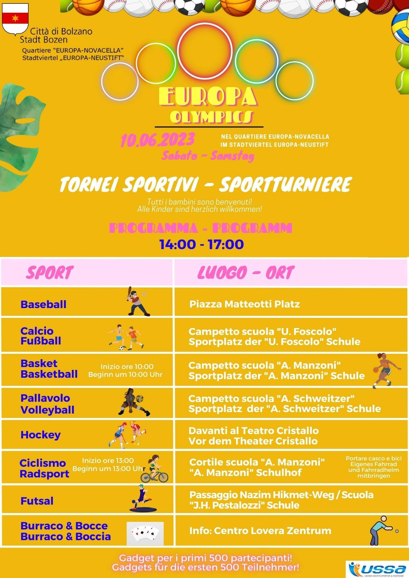 L'appuntamento è in programma sabato 10 giugno ad Europa-Novacella. Promosso dalla Quartiere e organizzato dall'USSA "Europa Olympics" un intero pomeriggio dalle 14.00 alle 17.00 dedicato allo sport e rivolto ai bambini di tutte le età. Nelle piazze, nei cortili, nei campetti del quartiere la possibilità di cimentarsi in vari tornei sportivi e divertirsi in tante discipline diverse. Dal baseball in piazza Matteotti, al calcio alle "Ugo Foscolo", dal volley alle "Schweitzer" al basket alle "Manzoni" (inizio ore 10.00). Ed ancora: Hockey davanti al Cristallo, ciclismo nel cortile delle "Manzoni" (inizio ore 13.00) e Futsal alle "Pestalozzi" (Passaggio Nazim Hikmet). Per i più grandi, burraco e bocce al Centro Lovera. Simpatico gadget per tutti i partecipanti. Alle 17.00 in programma la premiazione in piazza Matteotti e a seguire un concerto di musica live by Besides & Coobolt. Tutti (non solo i bambini) sono i benvenuti alla grande festa di sport del Quartiere Europa-Novacella.