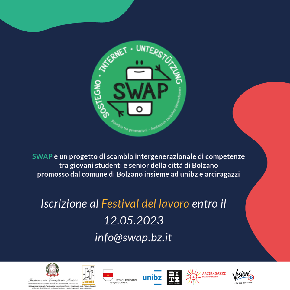 SWAP è un progetto di scambio intergenerazionale fra giovani e meno giovani volto a migliorare le competenze tecnologiche sempre più necessarie nella vita di tutti i giorni. Lo scopo è quello di superare il divario digitale che esclude una fascia di popolazione adulta, non tecnologica, dall’accesso ai servizi al cittadino e di fornire agli anziani maggiori competenze tecnologiche per essere più autonomi ad accedere a vari servizi online