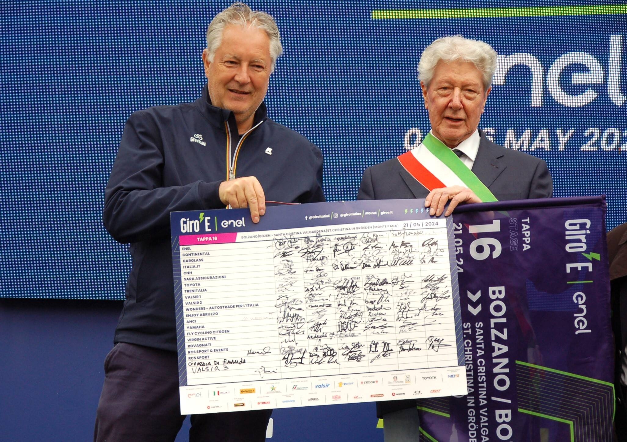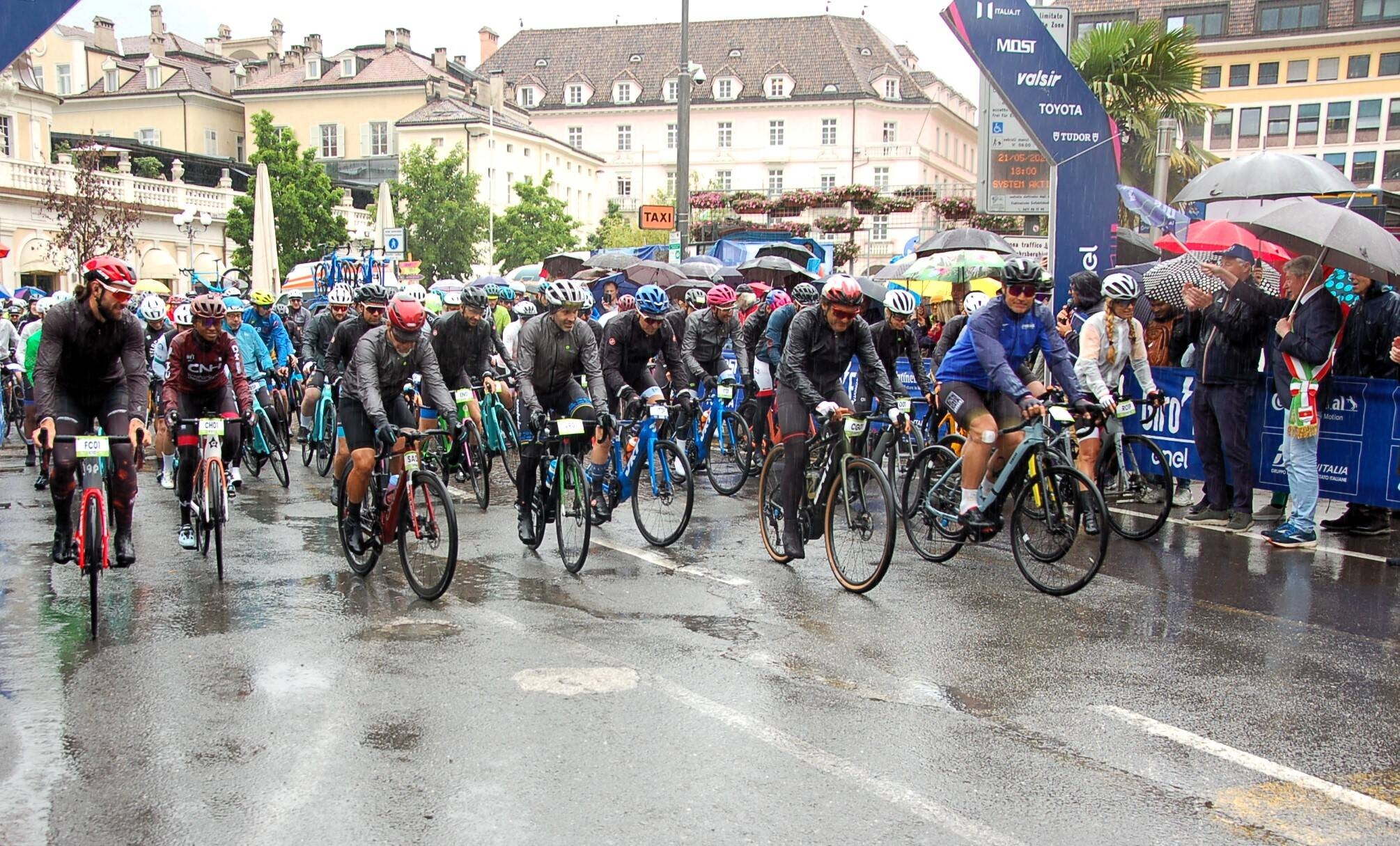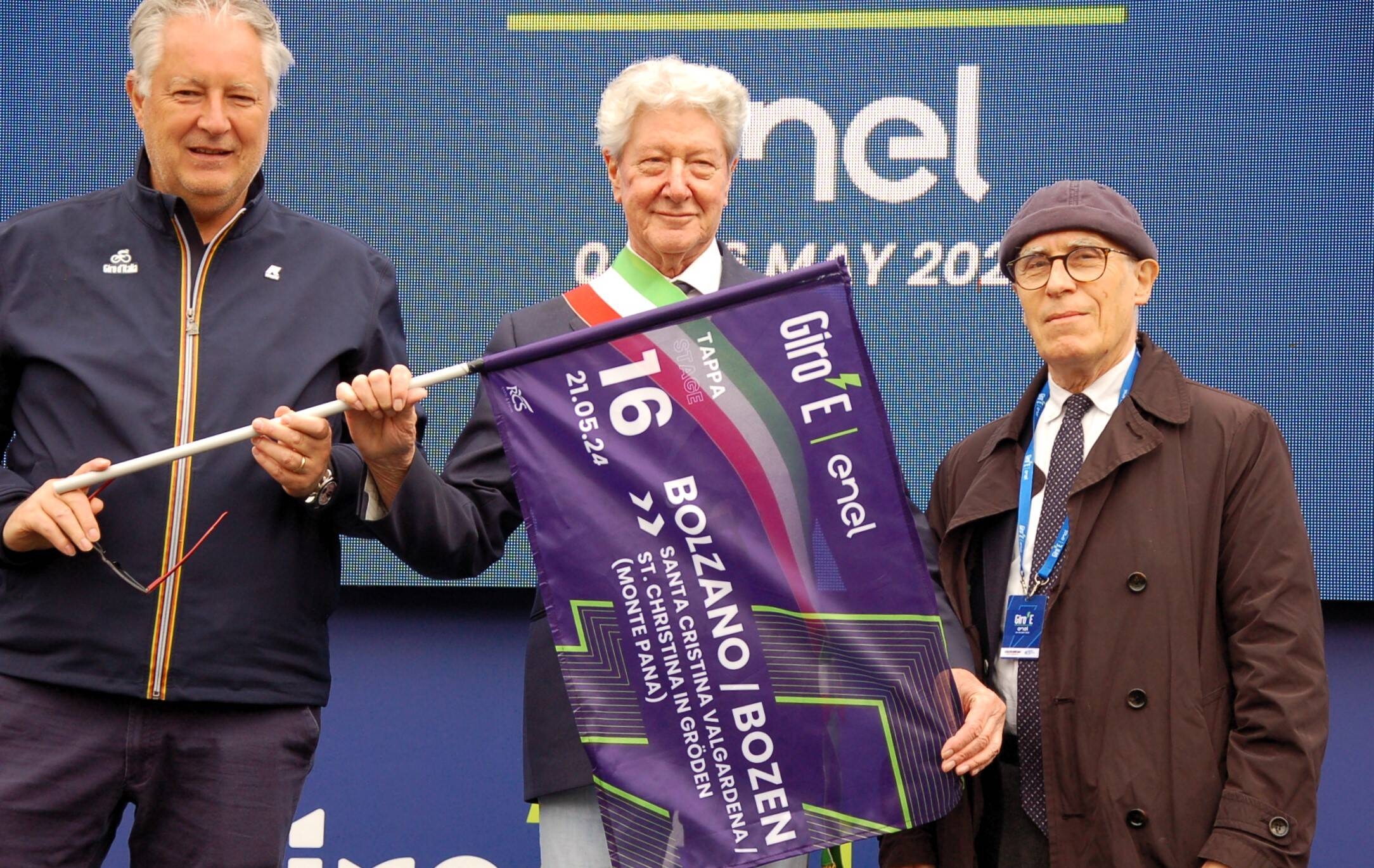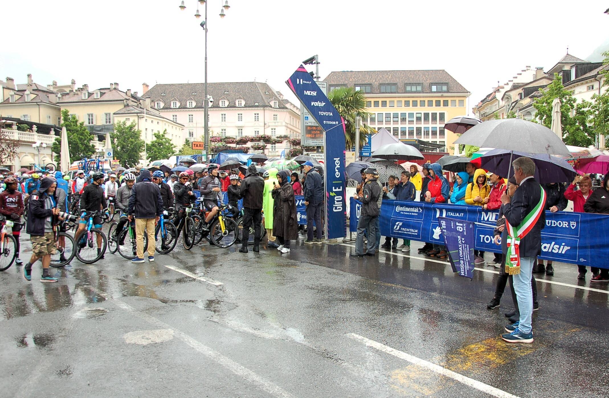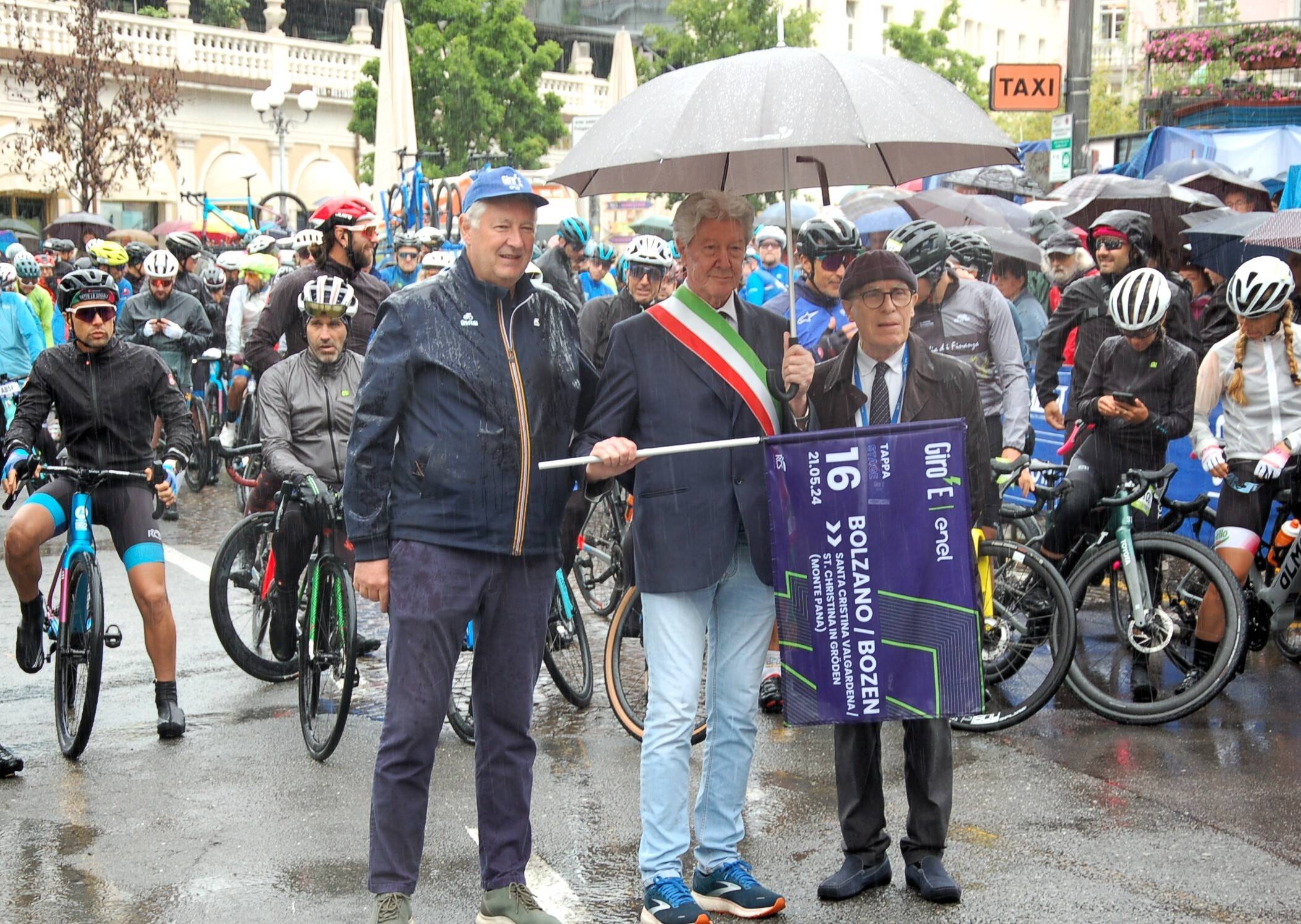 Nonostante la pioggia battente, grande entusiasmo stamane in piazza Walther, prestigiosa location trasformata per l'occasione in quartier generale del Giro E. Il salotto buono del capoluogo altoatesino è stato infatti teatro della partenza alle 13.00 in punto della 16a tappa del GIRO E, vera e propria "bike experience" unica nel suo genere a livello mondiale che si svolge nei giorni e sulle strade del Giro d’Italia. Starter d'eccezione, il Sindaco di Bolzano Renzo Caramaschi al quale è stata consegnata la bandiera di partenza del Giro E poi utilizzata per dare materialmente il via alla carovana rosa con bici a pedalata assistita e destinazione Monte Pana, a Santa Cristina di Val Gardena, al pari dei ciclisti della Corsa Rosa vera e propria. A promuovere l'iniziativa nel capoluogo altoatesino, l'Azienda di Soggiorno di Bolzano rappresentata sul palco ed in partenza dal suo Presidente Roland Buratti.