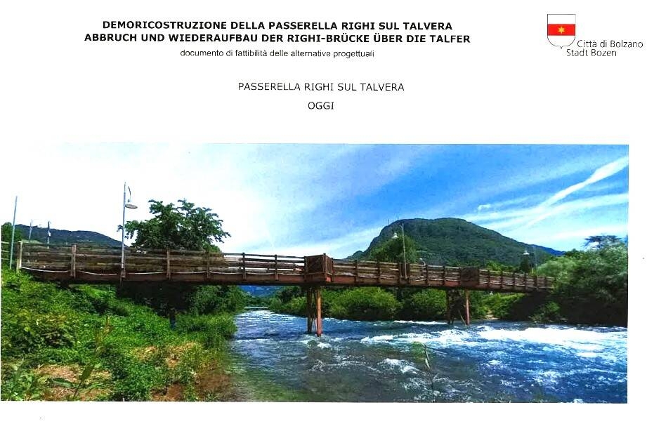 Approvato dalla Giunta comunale l'intervento di demo-ricostruzione della "passerella Righi" sul Talvera che ha circa 50 anni di vita dalla sua realizzazione. Il nuovo ponte proposto in acciaio Corten (acciaio arrugginito) ha caratteristiche strutturali e geometriche tali da permettere un miglioramento, sia del percorso pedo ciclabile di collegamento al centro storico, che una maggiore sicurezza idraulica e strutturale, con una maggiore resistenza e riduzione dei costi futuri di manutenzione. Importo stimato dell’opera: 1.543.300 Euro. Via libera anche al rifacimento dell'impianto di illuminazione (a led) dei campi da tennis di via Martin Knoller con una spesa di 43.374 Euro.
