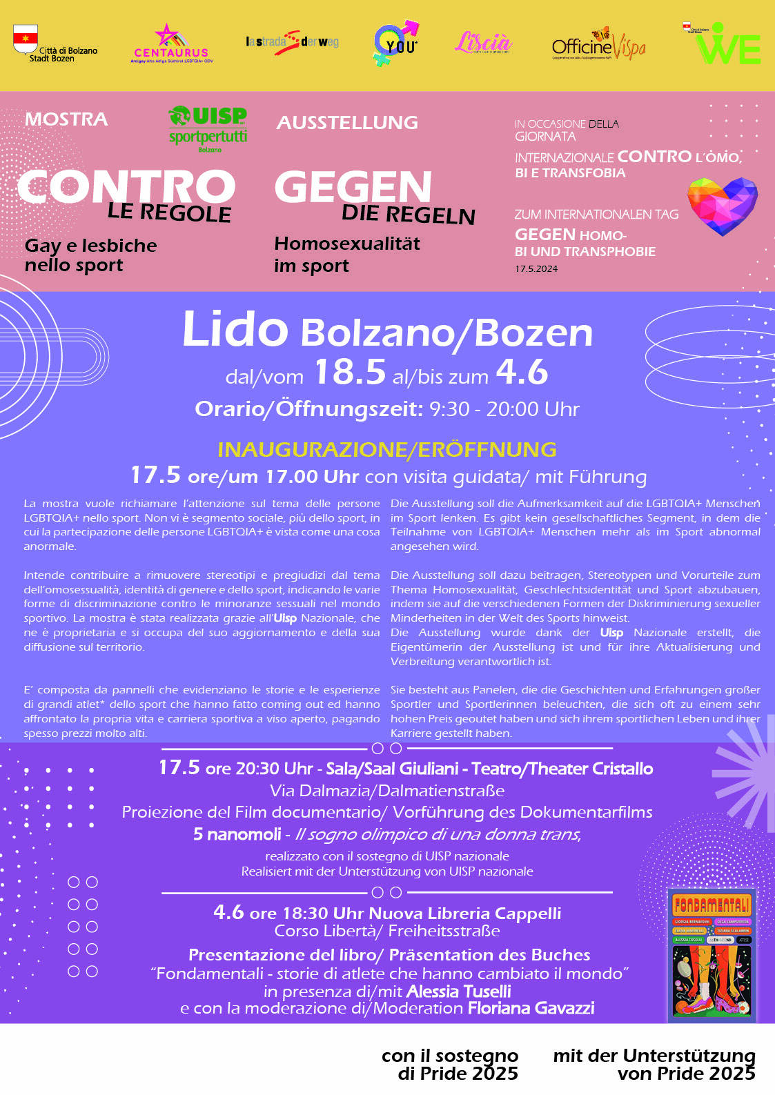 In occasione della Giornata internazionale contro l’omo, bi e transfobia di venerdi 17 maggio, l’Assessorato comunale alle Pari Opportunità ribadisce il suo impegno contro ogni forma di discriminazione, violenza e intolleranza. La rete WE Women Empowerment della Città di Bolzano con UISP, Centaurus, La Strada e Officine Vispa e in collaborazione con la UISP nazionale presenta la mostra: “Contro le regole. Gay e lesbiche nello sport” allestita al Lido di Bolzano. Alla presenza delle autorità cittadine e degli organizzatori, l'esposizione sarà presentata in anteprima alla stampa: