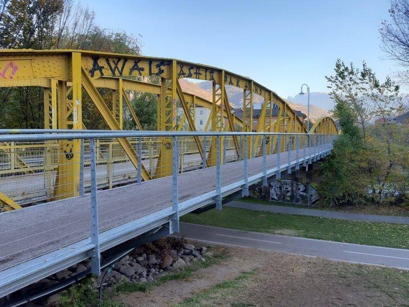 Sono terminati i lavori di manutenzione straordinaria del ponte pedociclabile sul Talvera, il cosiddetto "Ponte Giallo" (ex FS). Si tratta del vecchio ponte ferroviario della linea che portava a Caldaro trasformato in percorso ciclopedonale. Al ponte infatti sono state aggiunte in passato anche le strutture a sbalzo del marciapiede. Ultimi in ordine di tempo i lavori di demo-ricostruzione della soletta centrale e la riverniciatura di giallo delle storiche superfici metalliche. Al fine di presentare l'esito dell'intervento, il Vice Sindaco e Assessore ai Lavori Pubblici del Comune di Bolzano Stephan Konder promuove una: