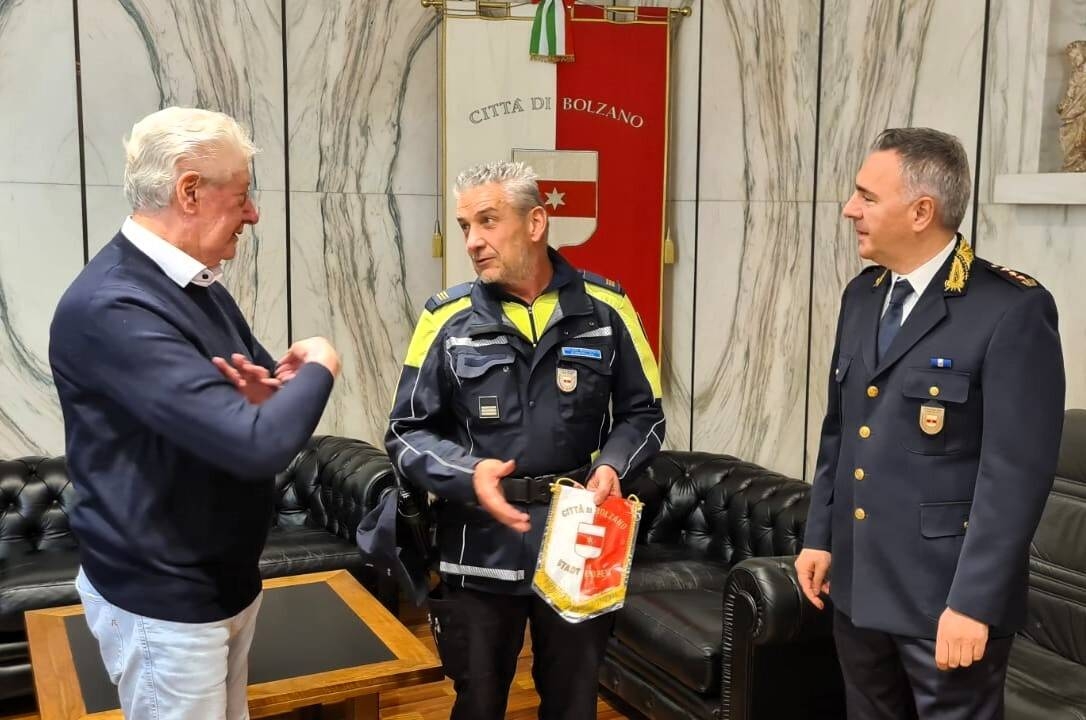 In municipio lo chiamano un po' scherzosamente il "Gonfaloniere": si tratta di Guido Tartarotti, vigile urbano in servizio da oltre 40 anni presso la Polizia Municipale di Bolzano, ormai prossimo alla pensione. Queste sono infatti le sue ultime settimane di lavoro essendo giunto al termine di una lunga e onorata carriera professionale. La particolarità del vigile urbano Tartarotti è che, praticamente da quando è entrato a far parte dei vigili urbani, è sempre stato lui a portare il gonfalone della Città di Bolzano nelle varie manifestazioni pubbliche. Sempre presente Guido Tartarotti, con il bello ed il cattivo tempo, in compagnia dell'altro vigile "gonfaloniere": l'inseparabile Gianluca De Vincenzi. In coppia, hanno tenuto anche materialmente alto il vessillo della Città di Bolzano, accompagnando Sindaci, Assessori, Consiglieri comunali e delegazioni istituzionali varie in tutte quelle cerimonie e manifestazioni pubbliche in Italia e anche all'estero, che prevedono la presenza del gonfalone cittadino. Nei giorni scorsi, in municipio, il Sindaco Renzo Caramaschi ed il Comandante Fabrizio Piras hanno voluto informalmente e a sorpresa, salutare e ringraziare Guido Tartarotti per l'ottimo servizio reso alla Città, facendogli dono di un gonfalone in miniatura, ossia il gagliardetto del Comune di Bolzano. Un piccolo, ma significativo e prezioso "ricordo di lavoro" che sicuramente Guido Tartarotti conserverà con cura e passione una volta in pensione.