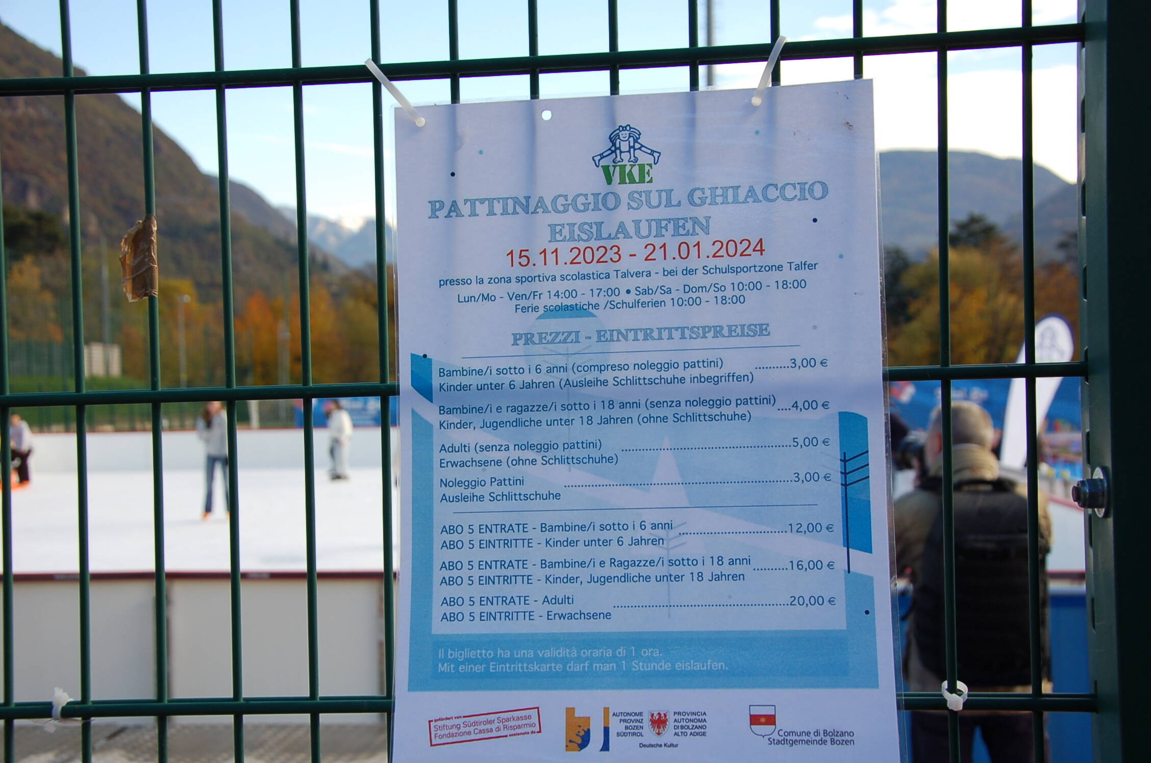 Stamane alla presenza dell'Assessore comunale allo Sport Juri Andriollo e dell'Assessora alla Scuola Johanna Ramoser, è stata ufficialmente inaugurata la pista di pattinaggio sul ghiaccio allestita sui prati del Talvera nella zona sportiva-scolastica con accesso da via Cadorna. La pista di pattinaggio è promossa e sostenuta dal Comune di Bolzano in collaborazione con la Provincia e la Fondazione Cassa di Risparmio, ed è gestita come di consueto dal VKE. Quest'anno saranno 10 le settimane di apertura dell'impianto; due in più rispetto allo scorso anno. Si potrà pattinare sino al 21 di gennaio.