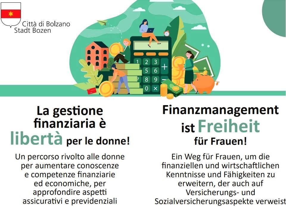 Allo scopo di provare a colmare la differenza di genere in ambito economico-finanziario l’Assessorato alle Pari Opportunità del Comune di Bolzano propone una serie di conferenze sull’educazione finanziaria rivolto specificatamente alle donne. Il progetto coinvolge varie figure professionali di Università di Bolzano, Banca d’Italia, Laborfonds e Centro Tutela Consumatori che interverranno su temi di economia, rapporti bancari, assicurativi e previdenziali. Complessivamente otto incontri di cui quattro in lingua italiana e quattro in lingua tedesca concentrati nel prossimo mese di ottobre. Gli incontri si svolgeranno nella sala conferenze dell’antico municipio di via Portici 30 con orario: 18.00-20.00.
