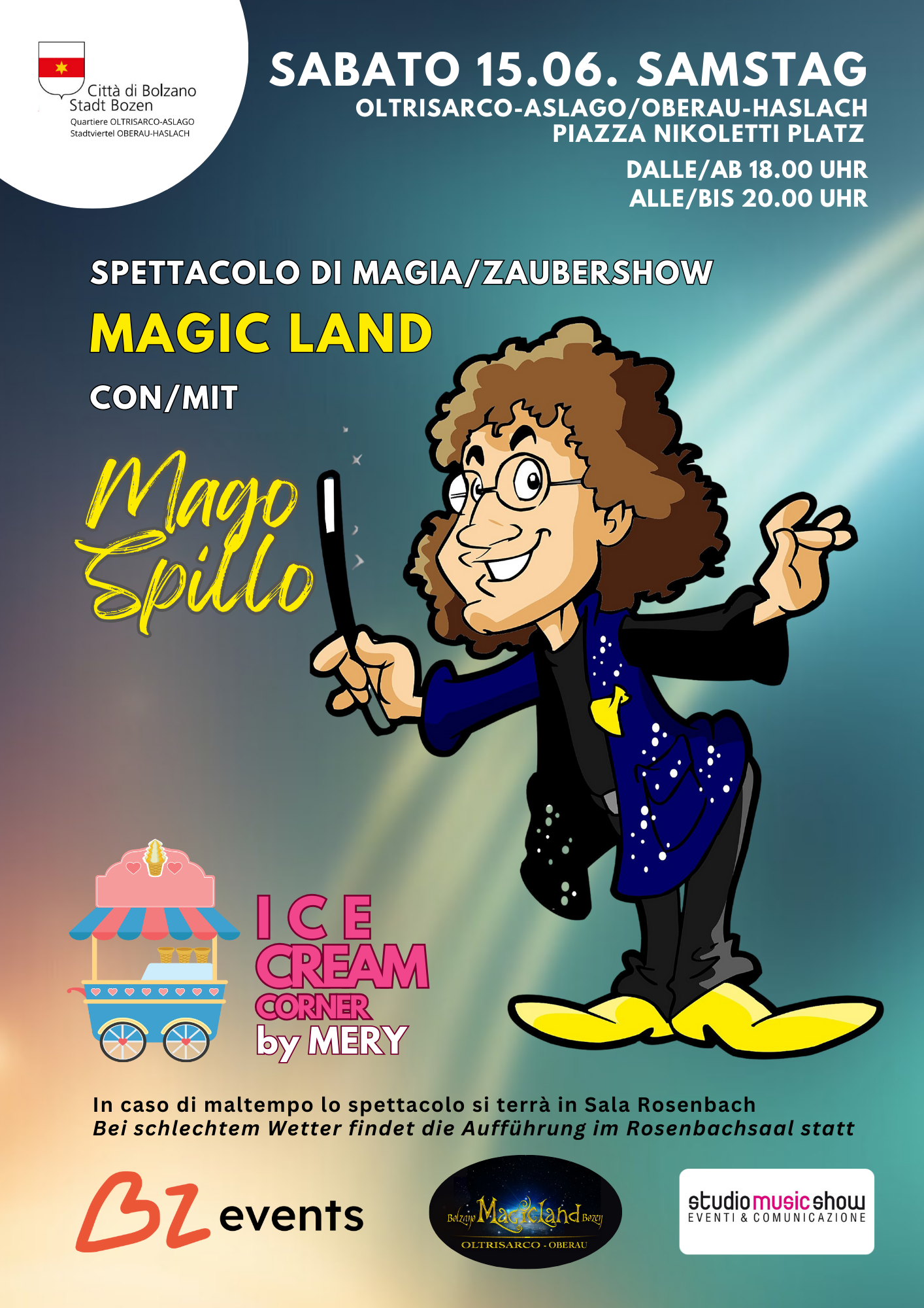 Sabato 15 giugno in Piazza Nikoletti a Oltrisarco secondo appuntamento della rassegna "Magic Land", serata di magia promossa dal Consiglio di Quartiere Oltrisarco-Aslago che questa volta vedrà come protagonista il Mago Spillo. Lo spettacolo avrà inizio alle ore 18:00. In caso di maltempo, lo show si svolgerà all'interno dell'attigua Sala Rosenbach. La rassegna di magia "Magic Land" è promossa dai Consigli di Quartiere Oltrisarco-Aslago e Gries-S.Quirino con tre diversi appuntamenti: il primo svoltosi in Sala Rosenbach il 7 aprile scorso con il mago Andrea Paris, il secondo appunto SABATO 15 GIUGNO in Piazza Nikoletti con il Mago Spillo e l'ultimo appuntamento il 14 settembre in piazza Mazzini con il mago Davide Allena. La cittadinanza è invitata a partecipare.
