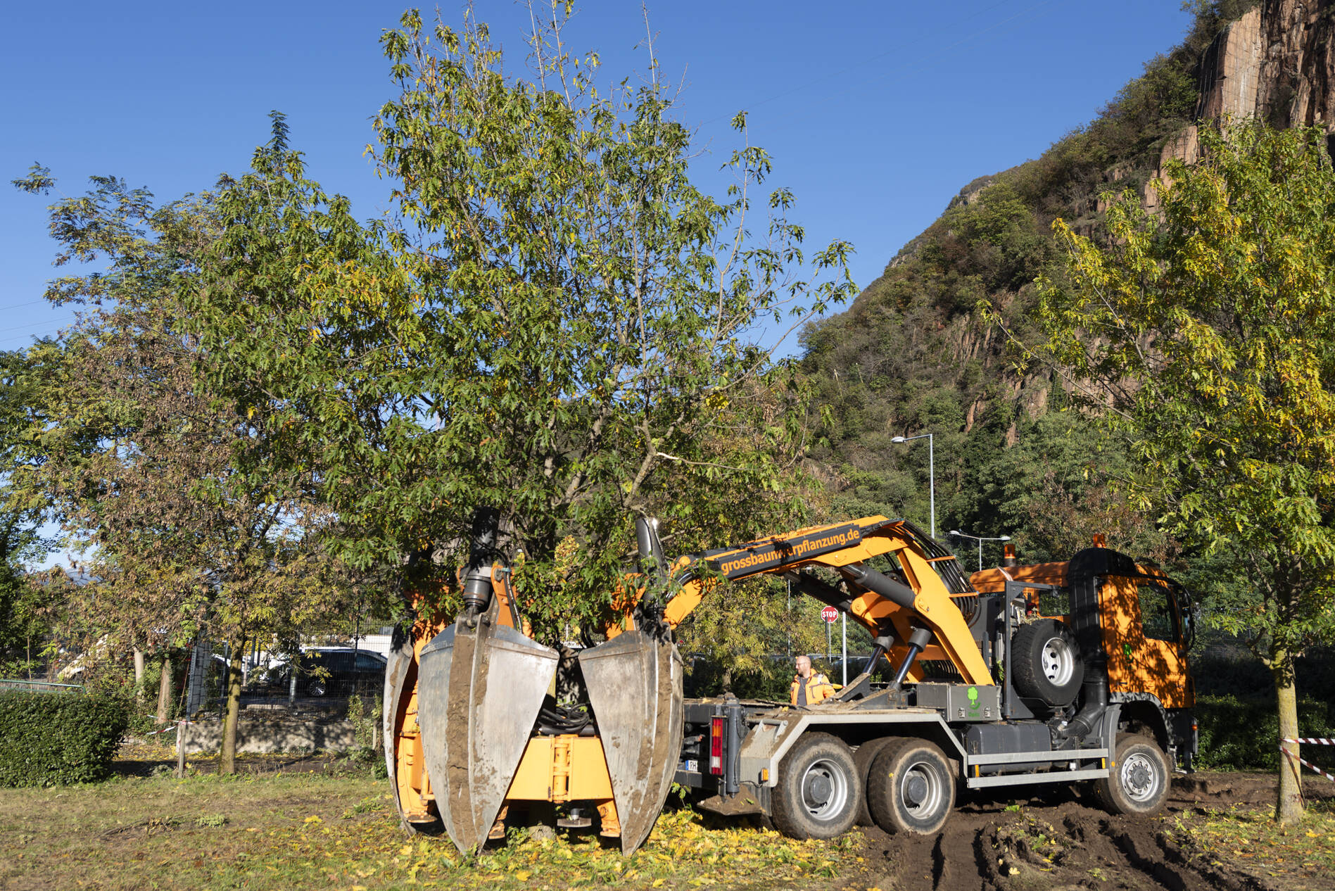Nelle foto la macchina zollatrice e gli alberi trasportati.