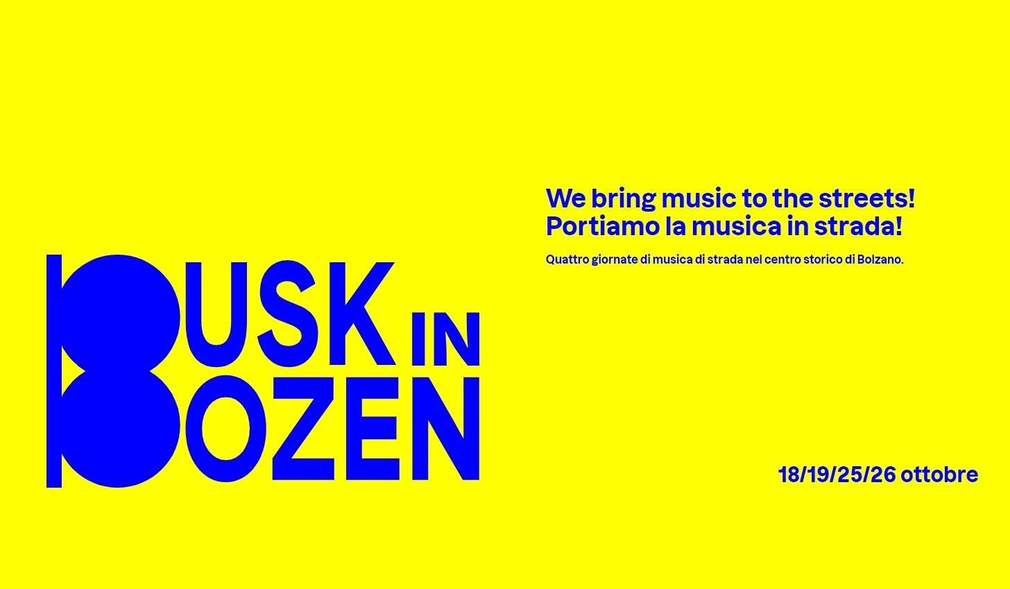 BUSK IN BOZEN - We bring music to the streets! Portiamo la musica in strada! Obiettivo: portare la musica degli artisti locali nelle strade e nelle piazze del centro cittadino. In futuro prevista l'estensione del programma musicale in tutti i quartieri del capoluogo. Allo studio anche la creazione di spazi all'aperto permanenti da dedicare ai musicisti ed agli artisti di strada.