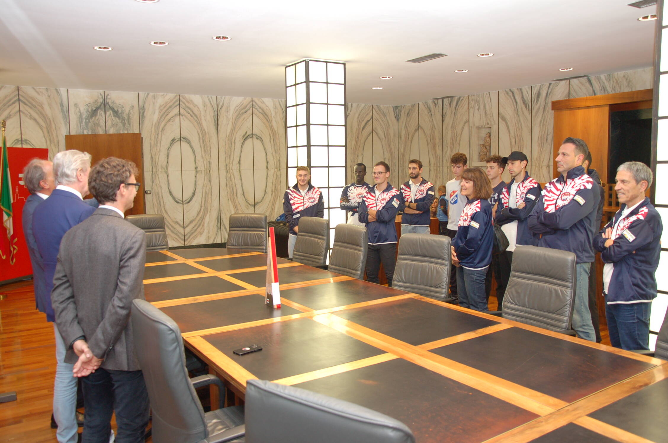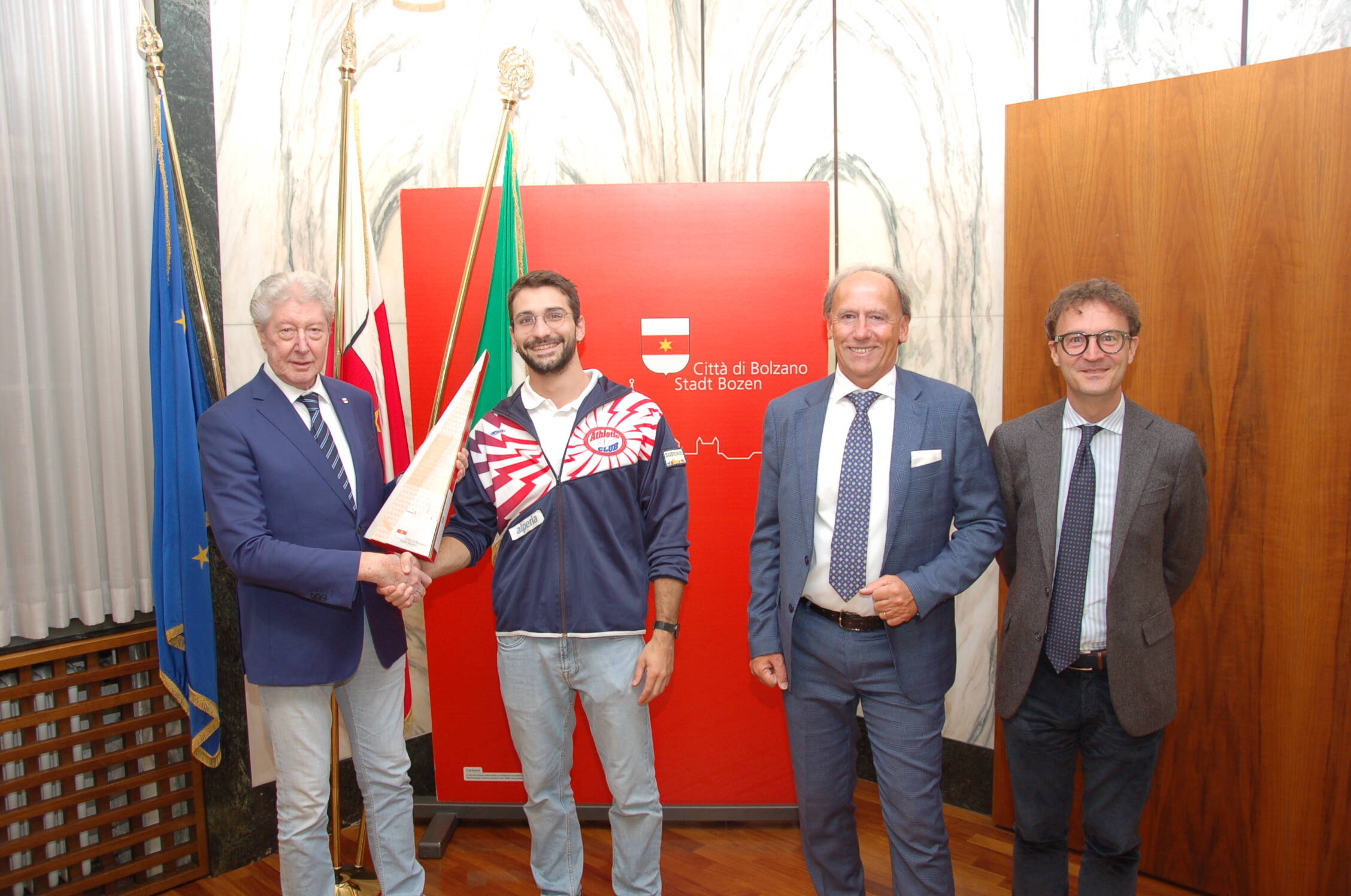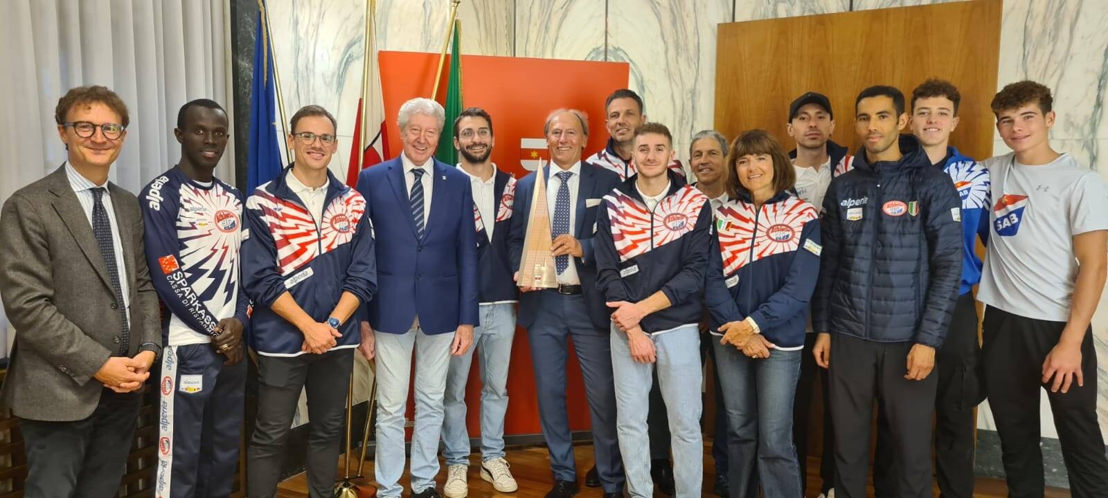Festa grande in Municipio per atleti e dirigenti dell’Athletic Club 96 Alperia di Bolzano che nella Finale Oro dei Campionati Assoluti di Società di atletica leggera a Modena, ha recentemente conquistato lo Scudetto Tricolore 2024, il quarto della storia del sodalizio presieduto da Bruno Telchini. Gli atleti biancorossi sono stati ricevuti e premiati in municipio dal Sindaco Renzo Caramaschi e dell’Assessore comunale allo Sport Juri Andriollo. Una straordinaria prestazione corale della squadra maschile, coronata da sei vittorie individuali, un secondo posto e due terzi posti, ha regalato al capoluogo altoatesino l’ennesimo trionfo. Si tratta della quarta vittoria negli ultimi 6 anni, a dimostrazione della forza e continuità della squadra. All’incontro con gli amministratori comunali hanno partecipato anche alcuni tra i migliori giovani atleti della SAB (Società Atletica Bolzano) naturale vivaio sportivo dell’Athletic Club. Ai neo Campioni d’Italia, oltre ai complimenti del Sindaco e dell'Assessore allo Sport, anche un prestigioso trofeo della Città di Bolzano.