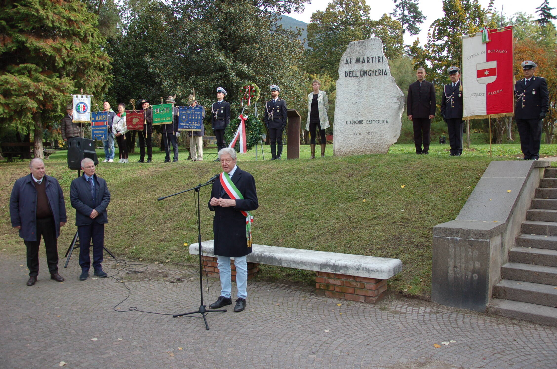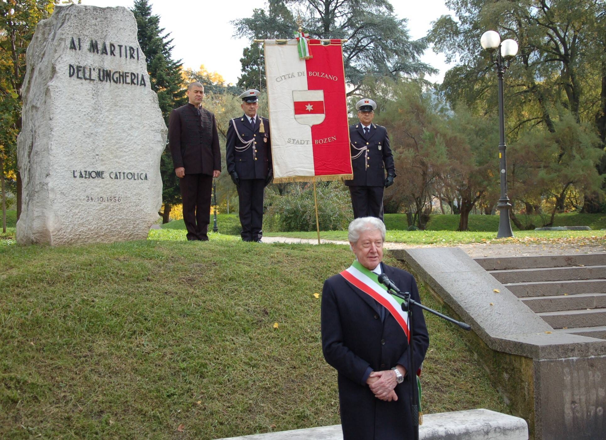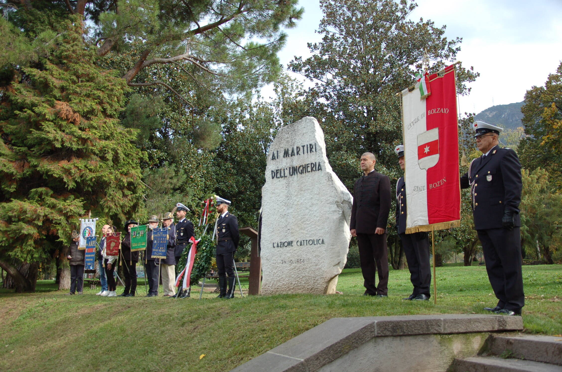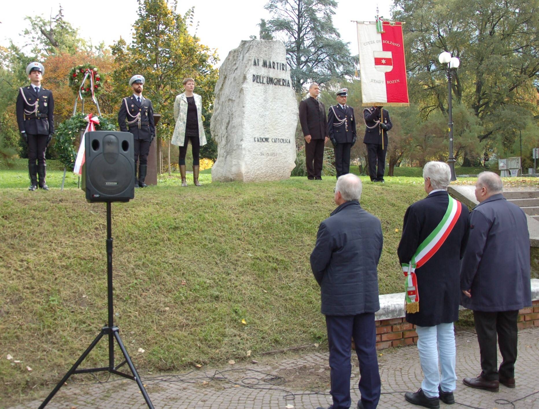 Il 23 ottobre di ogni anno ricorre l'anniversario dei Martiri d'Ungheria. Si ricordano le vittime della rivolta iniziata il 23 ottobre del 1956 quando a Budapest un'enorme folla si ritrovò per protestare e chiedere riforme. Quel motto di libertà venne bruscamente interrotto solo poche settimane più tardi e duramente represso. Morirono 2.700 ungheresi e oltre 700 soldati sovietici. Migliaia i feriti, mentre oltre 250.000 persone furono costrette a lasciare il proprio Paese. Stamane la Città di Bolzano ha promosso la consueta Cerimonia di commemorazione dei Martiri d'Ungheria alla presenza del Sindaco Renzo Caramaschi, del Commissario del Governo Vito Cusumano, del Questore Paolo Sartori, dell' autorità politiche, civili e militari, dell'ANPI e delle associazioni combattentistiche e d'arma. Dapprima l'omaggio sulla stele che a Parco Petrarca si affaccia su piazza IV Novembre e ricorda i Martiri d'Ungheria, quindi l' intervento del primo cittadino, che ha ricordato il legame speciale di Bolzano con il popolo ungherese anche in virtù del gemellaggio con la cittadina ungherese di Sopron e non solo.