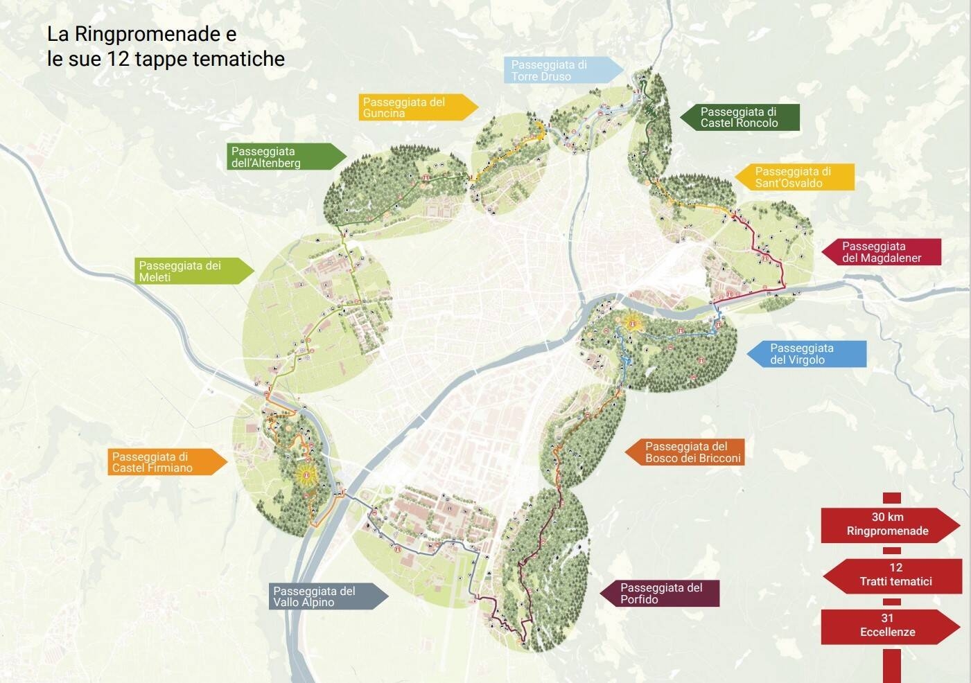 Dopo un’approfondita fase preparatoria svolta dal Servizio Tecnico Ambientale e di Progettazione del Verde nel 2023, il raggruppamento temporaneo di progettazione LAND Italia e Ingena s.r.l. di Bolzano è stato incaricato di realizzare lo studio dei possibili tracciati del percorso della Ringpromenade. Obiettivo; collegare tra loro le passeggiate ed i sentieri storici esistenti attraverso alcuni nuovi percorsi, per realizzare un anello di circa 30 km, che permetta, partendo dalla città, di esplorare i paesaggi circostanti, riscoprendo le numerose eccellenze e valorizzandole e raccontandone la storia. Oltre a questo, lo studio ha sviluppato un concetto di design e materiali che caratterizzino la Ringpromenade in maniera univoca nonché un concetto per il marketing, compreso un logo, un sito ed una App.