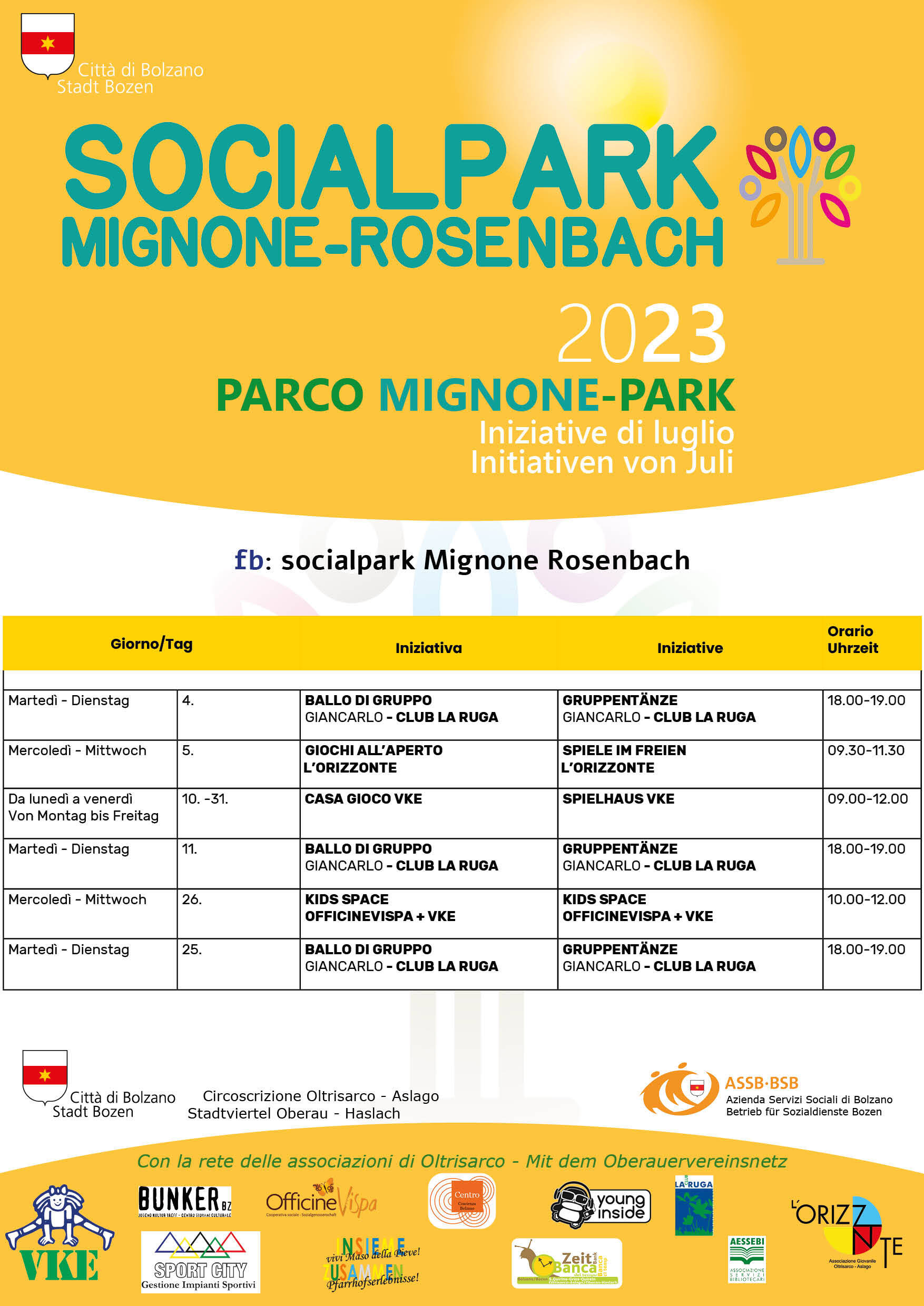 L’iniziativa è nata nel 2010 come “Estate al Parco Mignone” su stimolo del Distretto Sociale Oltrisarco/Aslago in collaborazione con il Comune di Bolzano e grazie al lavoro di rete delle realtà del territorio. Sociapark Mignone-Rosenbach si ripete anche quest’anno, visto il successo ottenuto, avendo quali vere protagoniste le associazioni del quartiere. L'obiettivo rimane quello di favorire il coinvolgimento dei territori e delle persone che li vivono, proponendo unione attraverso la creazione di relazioni, dialogo intergenerazionale. Due mesi e mezzo di iniziative, rese possibili grazie al coinvolgimento delle numerose realtà della zona, che hanno accettato di buon grado di mettersi in gioco, creando una vera e propria rete. All’ingresso del parco affisso il “programma mensile”, con l’elenco delle iniziative proposte, consultabile anche sul sito del Comune e su FB: Socialpark Mignone Rosenbach. Per i più piccoli giochi, laboratori artistici, attività sportive, mentre per gli adulti ballo, partite a bocce, e altro ancora. L’idea nasce dall’esigenza di dare la possibilità ai cittadini di vivere il parco e di vedere lo stesso come risorsa per le relazioni tra i cittadini.