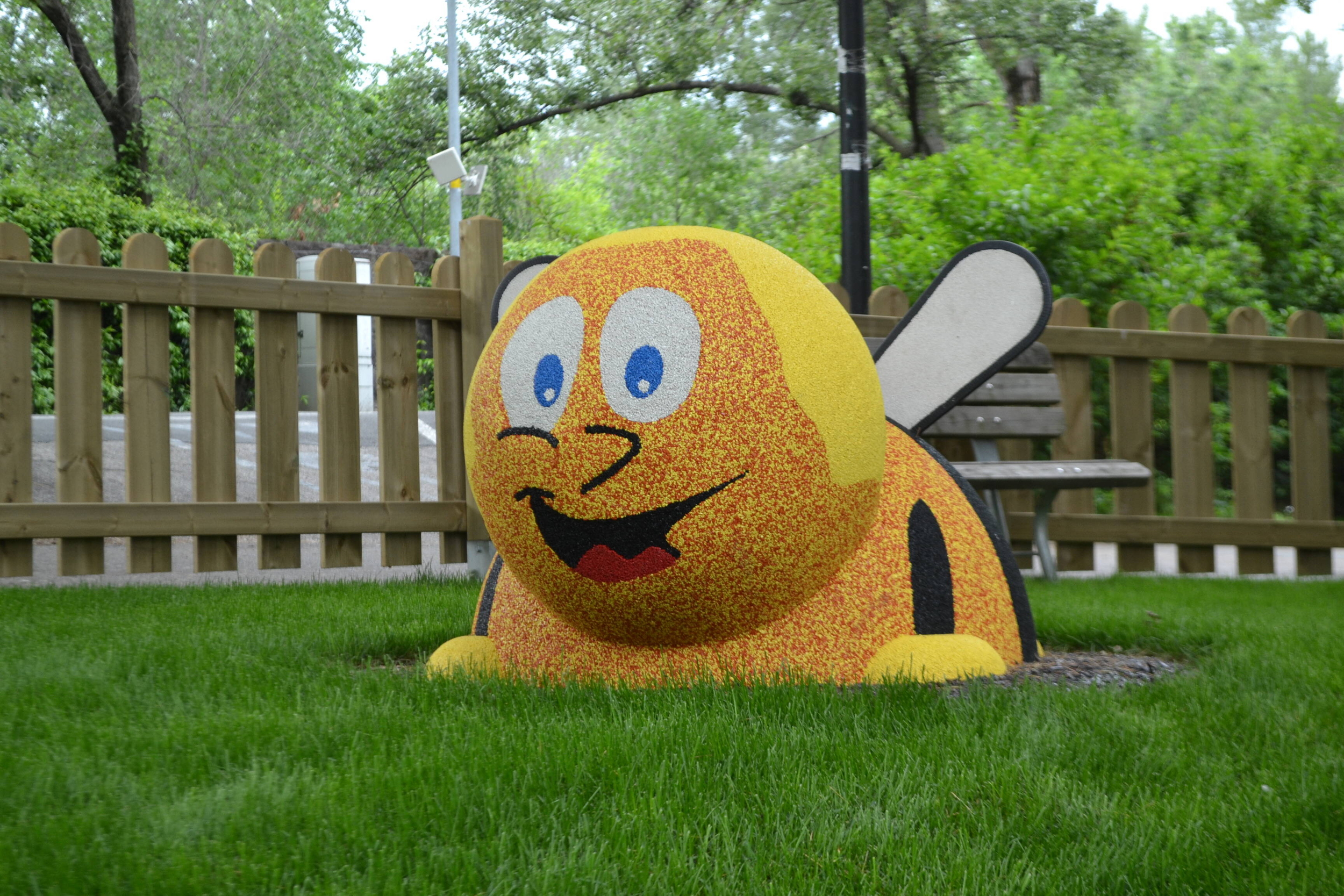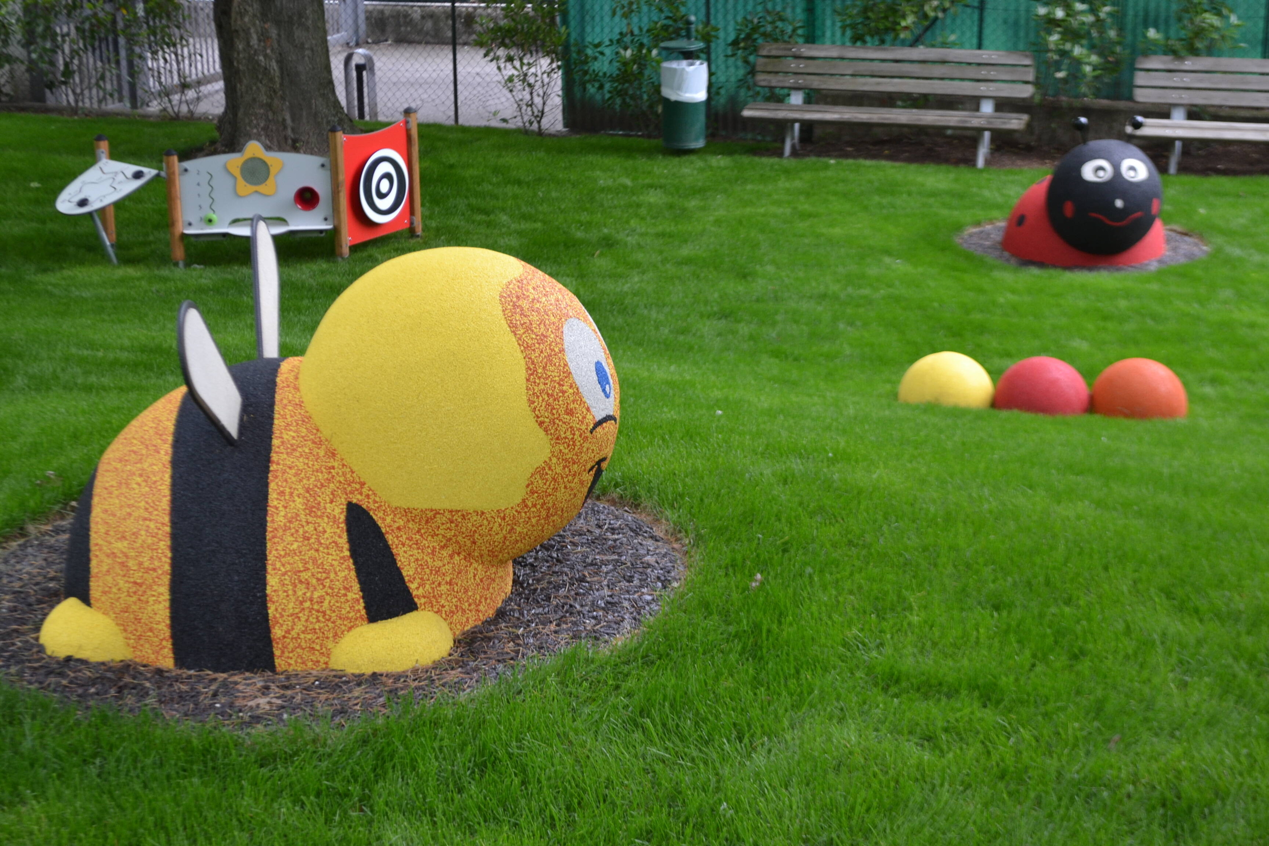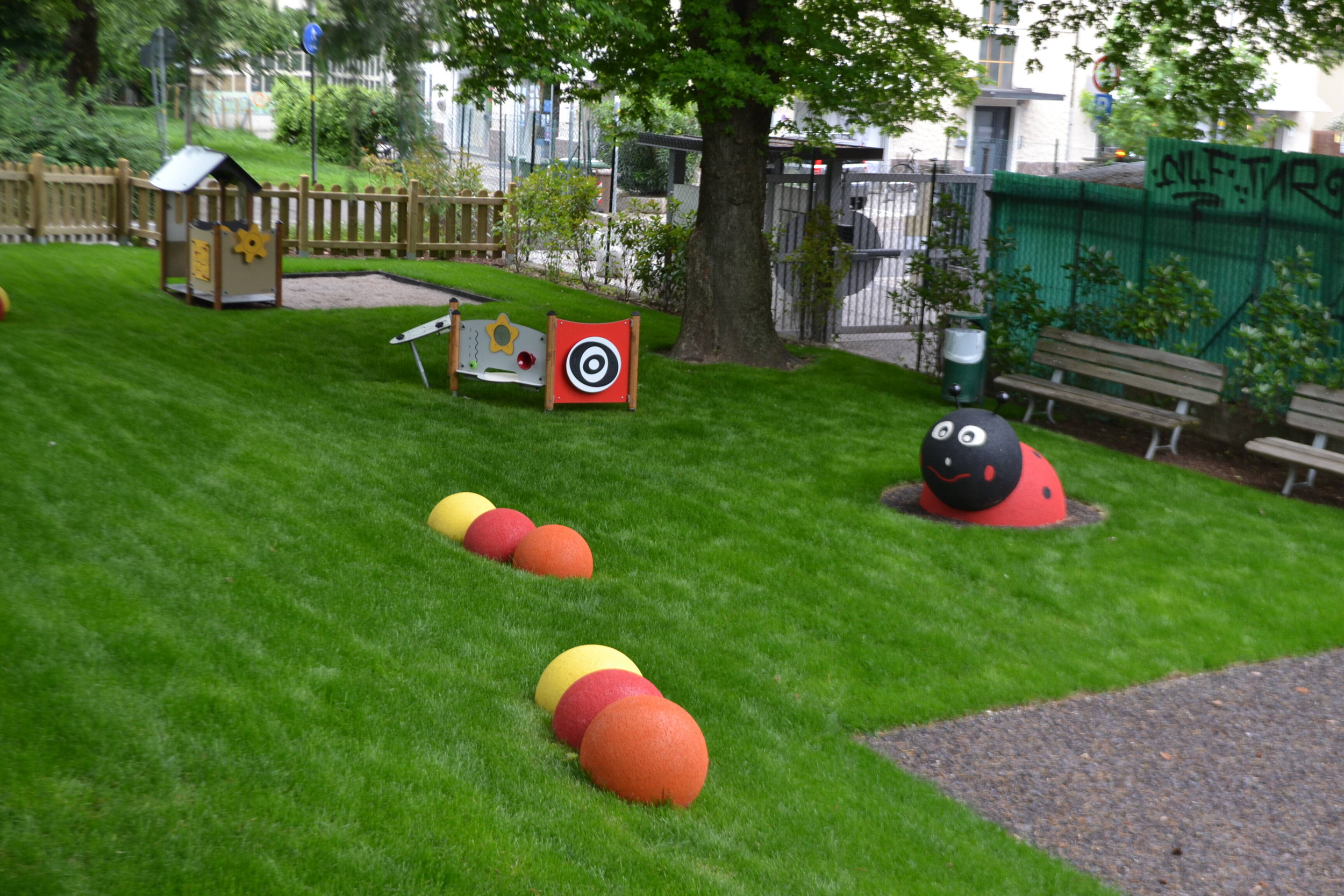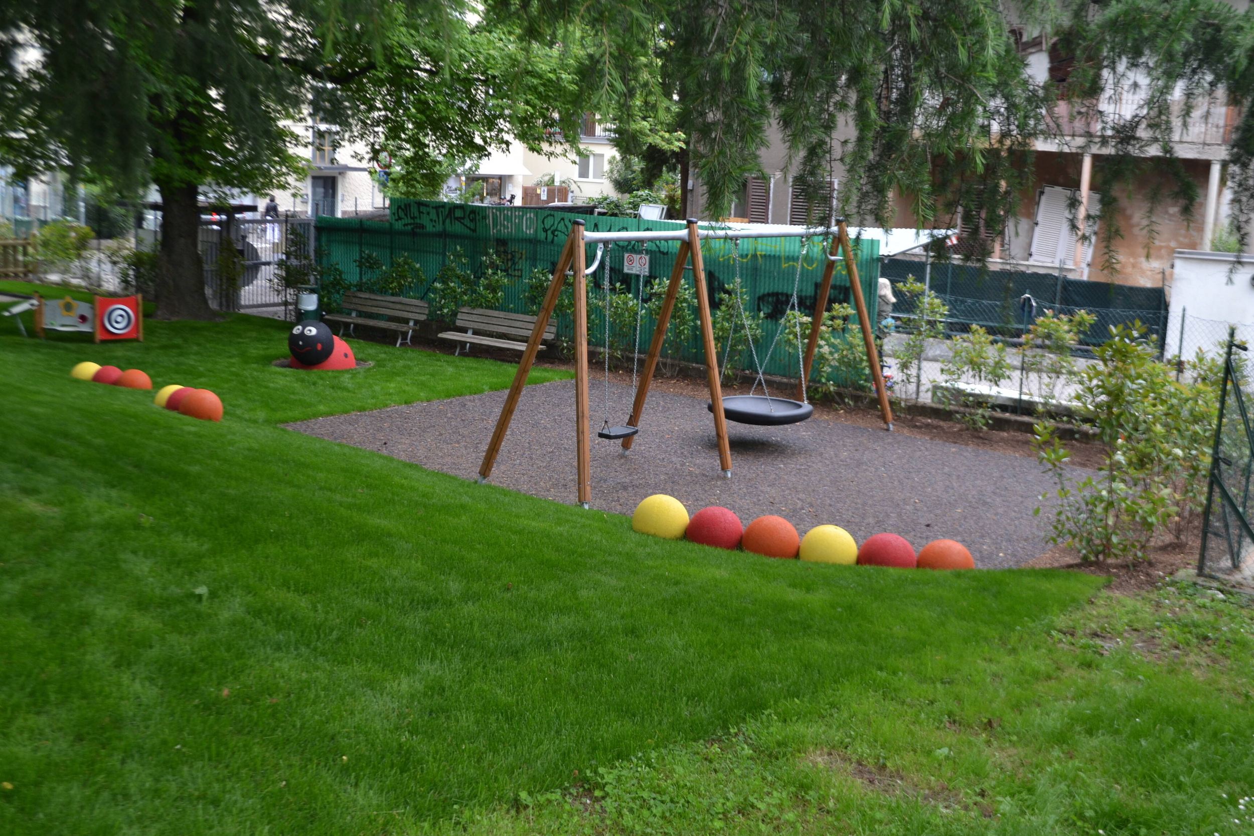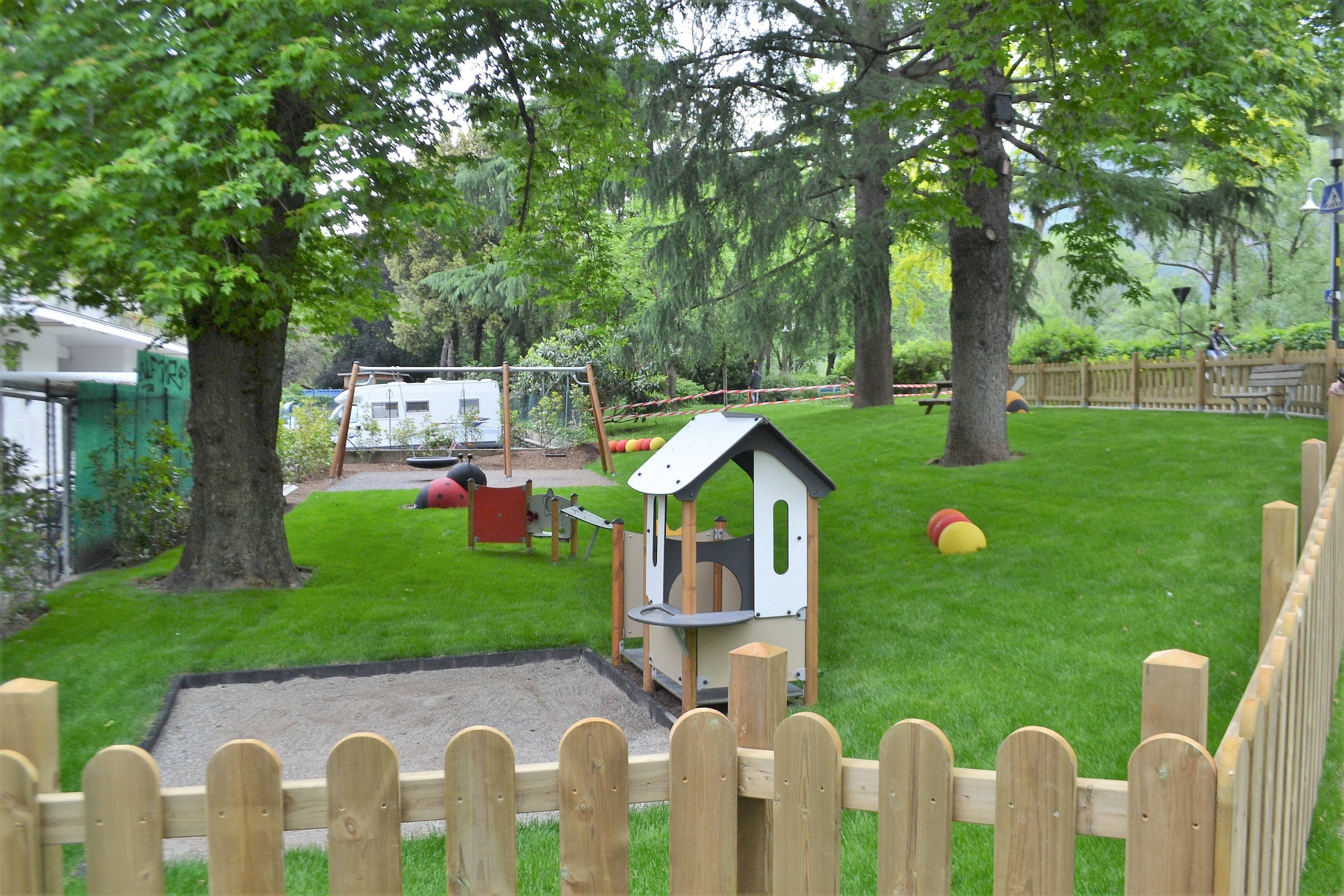 I nuovi giochi su un'area complessiva di circa 400 mq, consistono in una casetta con sabbiera, pannelli ludici, un’altalena doppia con seggiolino a tavoletta e uno a cesto utilizzabile da più bambini contemporaneamente. Abbelliscono l’area due simpatiche figure in gomma a forma di ape e coccinella e alcune sfere colorate anch’esse in gomma che oltre a limitare il dilavamento della scarpata potranno essere utilizzate come seduta. I giochi e la pavimentazione adempiono ai parametri di sicurezza della normativa europea in materia.