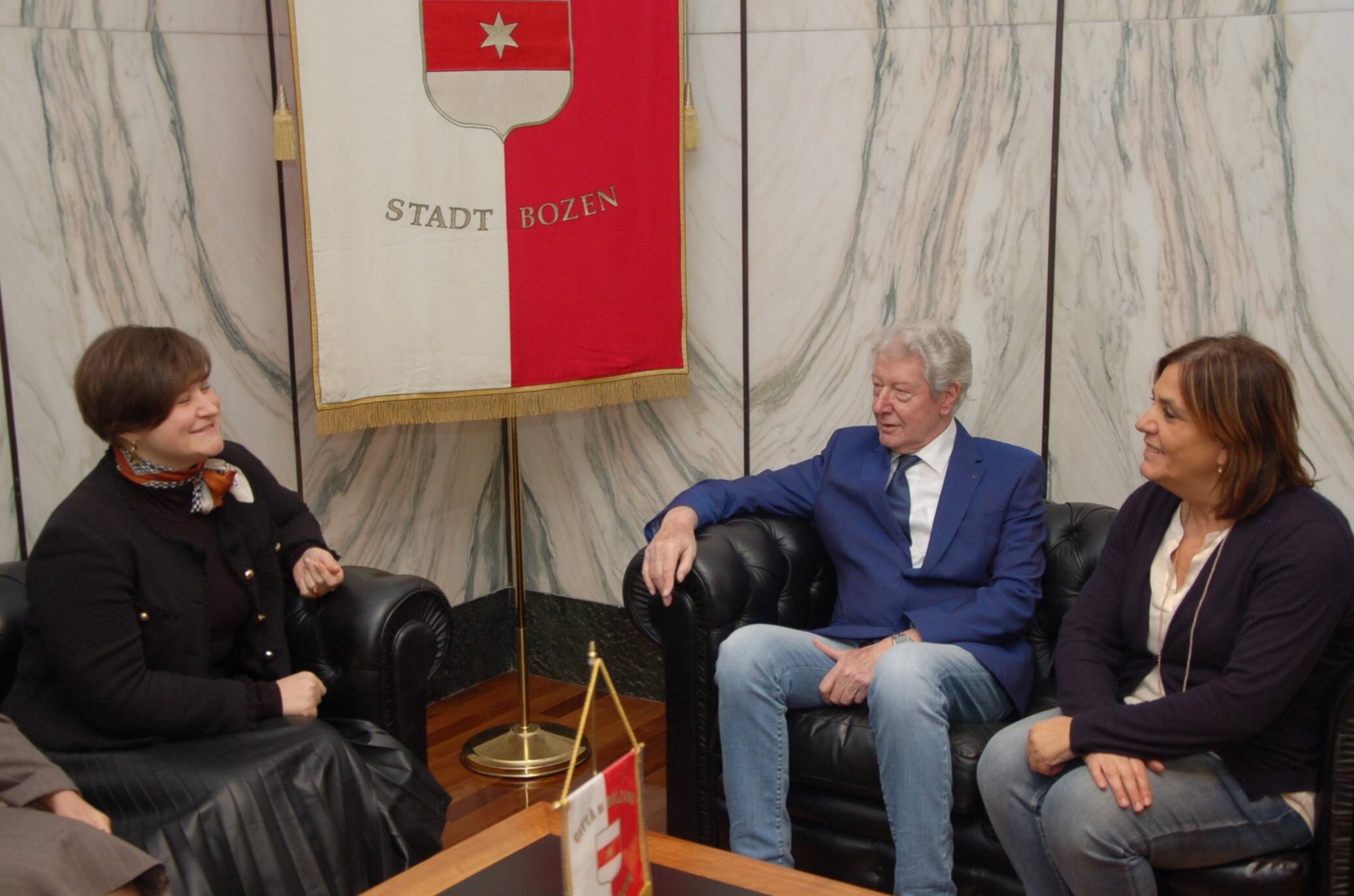 Il Sindaco di Bolzano Renzo Caramaschi e l'Assessora comunale alla Cultura Chiara Rabini, hanno ricevuto nel pomeriggio in municipio Oleksandra Romantsova direttrice del Centro per le libertà civili di Kiev in Ucraina, l'organizzazione umanitaria che nel 2022 ha vinto il premio Nobel per la Pace.