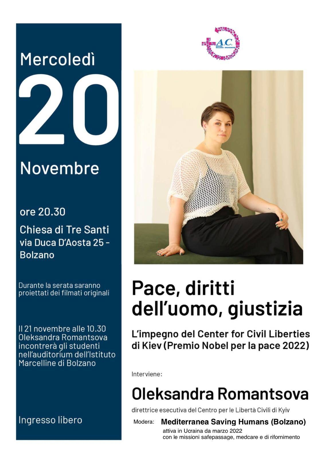 L'ONG è stata fondata nel 2007 ed è dedita alla documentazione di crimini di guerra, abusi sui diritti umani e abusi di potere. Si tratta della prima organizzazione ucraina a ricevere un Nobel per la Pace. L'attuale direttrice, eccezionale testimone della pace e dei diritti, è a Bolzano su invito dell'Azione Cattolica ed in serata incontra la cittadinanza nella chiesa di Tre Santi per un incontro pubblico su temi legati alla pace, ai diritti dell'uomo, e alla giustizia. Domani giovedì 21 novembre Oleksandra Romantsova incontrerà alcune classi di studenti del Liceo Linguistico Marcelline.