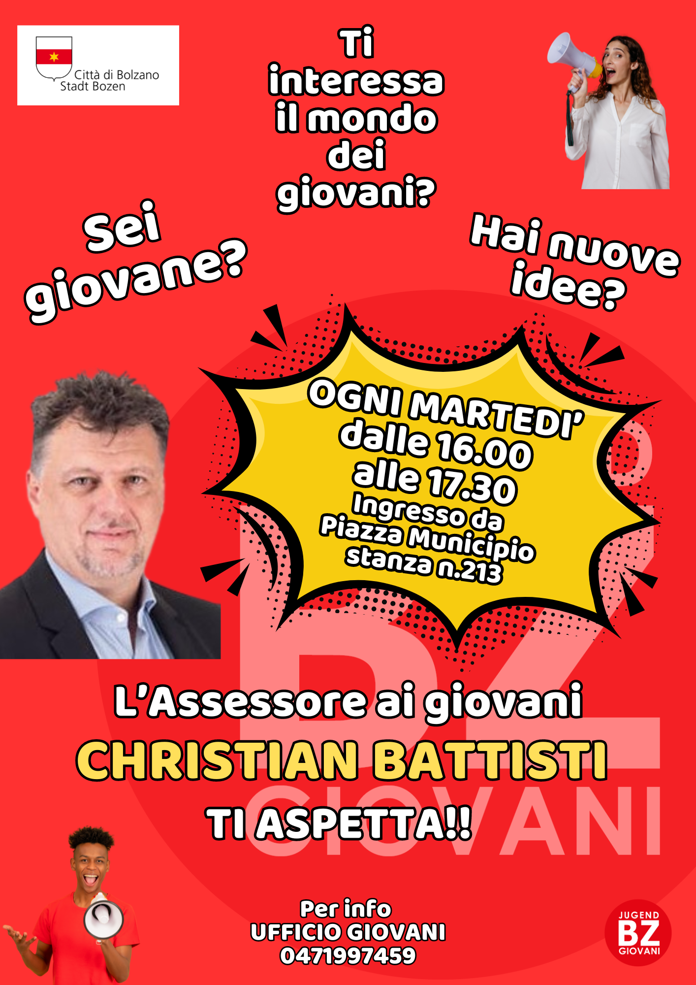 Ogni martedí dalle ore 16:00 alle ore 17:30 l'assessore comunale Christian Battisti accoglie i giovani presso il proprio ufficio - vicolo Gumer 7, secondo piano, stanza 213 - per dialogare, confrontarsi su eventuali problematiche o nuove proposte legate al mondo dei giovani.