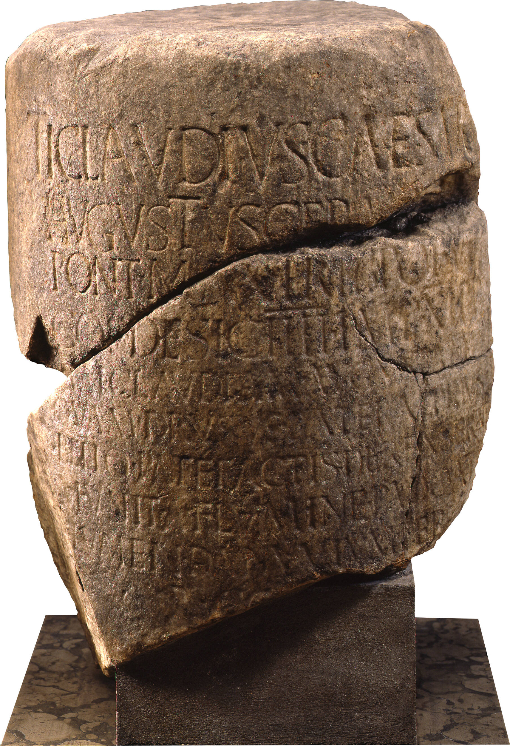 L’iscrizione in latino riferisce che Claudio (41-54 d.C.) nel 46 d.C. fece eseguire importanti lavori di riparazione della prima strada che congiungeva il fiume Po al Danubio, la via Claudia Augusta, precedentemente costruita dal padre dell’Imperatore, Druso.