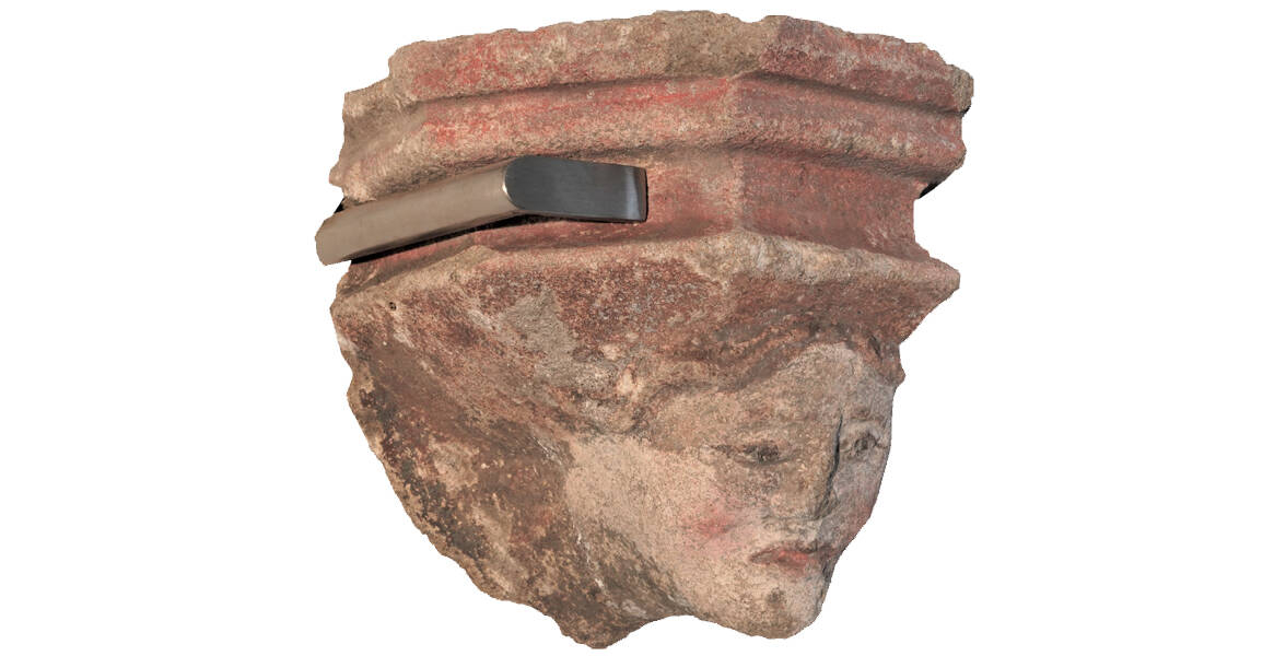Il ritrovamento inaspettato è una mensola in pietra arenaria leggermente giallastra e a grana grossa, che porta ancora porzioni considerevoli della pittura originale a colori. La base della mensola, dipinta di rosso, ha una forma poligonale ed è fortemente modanata. Al di sotto è scolpito un volto umano, forse di donna, incorniciato da capelli ondulati, con gote, sopracciglia e labbra dipinte con colore rosso, mentre le pupille sono definite in nero.